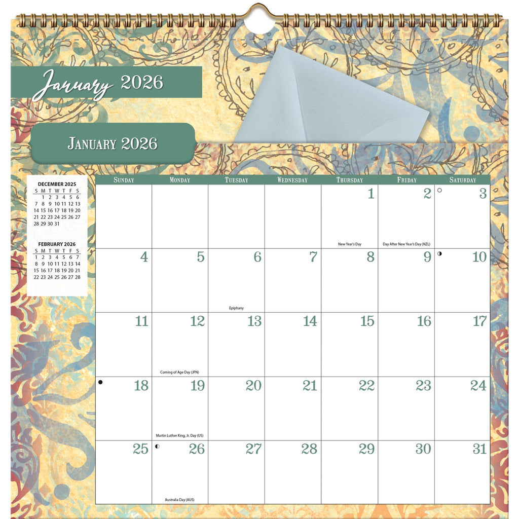 Le calendrier WSBL Bohemian 2026 File-It™ est à la fois un agenda et un système de classement ! Notez vos rendez-vous sur la grande grille et rangez vos documents dans le dossier intégré pour chaque mois ! Une section « Notes » au dos vous permet d'étiqueter le contenu. De plus, l'agenda est entièrement décoré d'éléments créés par l'artiste Susan Winget !