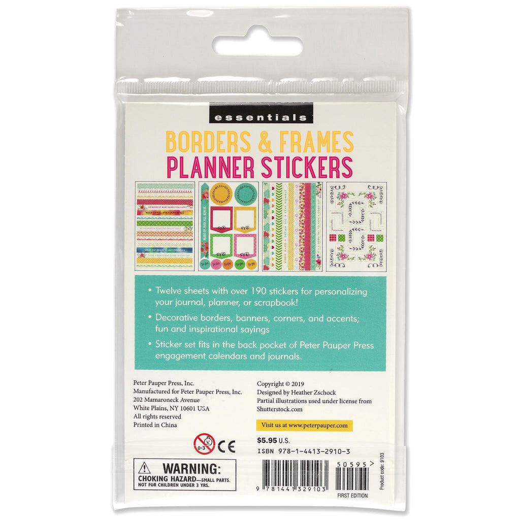 Embellissez votre journal, agenda ou album avec des centaines de bordures et cadres élégants ! Ce lot comprend plus de 190 autocollants différents, de formes et de couleurs variées. Bordures décoratives, bannières, coins, accents, phrases inspirantes et bien plus encore. Des couleurs et des styles éclatants. Parfait pour les bullet journals, agendas, calendriers et albums souvenirs. Ce lot d'autocollants se glisse facilement dans les pochettes arrière des calendriers et journaux Peter Pauper Press. Dimensions de l'emballage : 10 cm de large x 19 cm de haut.