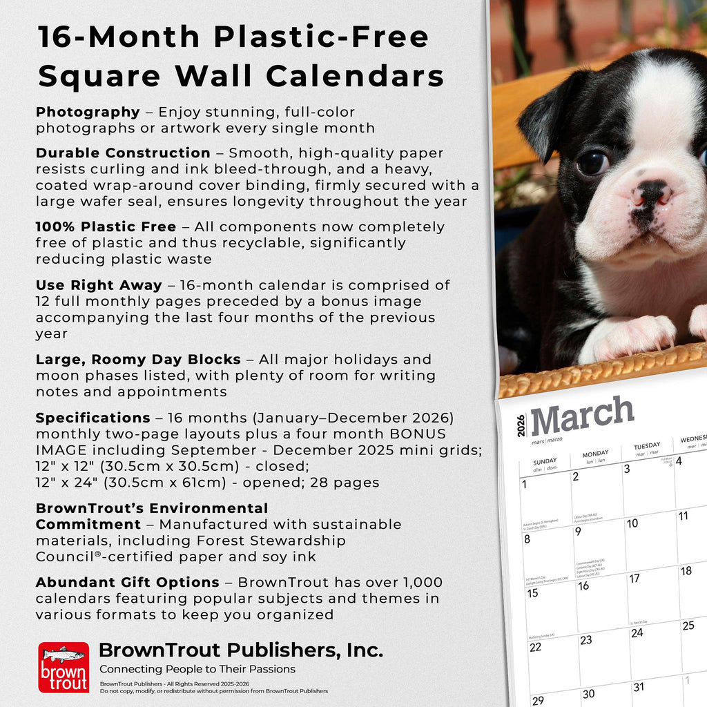 Les adorables chiots Boston Terrier aux grands yeux de ce calendrier deviendront des chiens affectueux. Malgré leur petite taille, les Boston Terriers débordent de personnalité. Intelligents et joueurs, ces jeunes chiens sont curieux et joyeux. Les craquants chiots de ce calendrier Boston Terrier feront le bonheur des amoureux des chiens et de leurs maîtres.