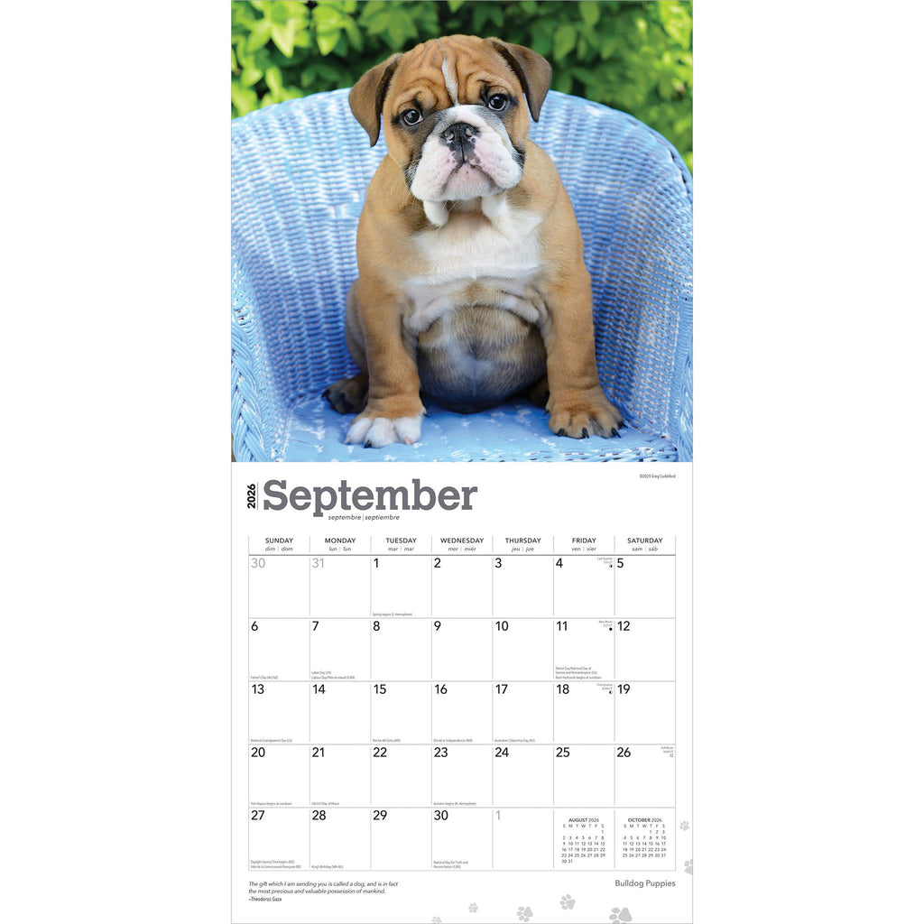 Les chiots bouledogues grandissent, mais ils gardent leurs rides et leur personnalité. Ces adorables chiots sont curieux et intelligents, affectueux et câlins. Une activité physique légère leur fait le plus grand bien. Ce calendrier de chiots bouledogues regorge de ces petites boules de poils pleines de joie.