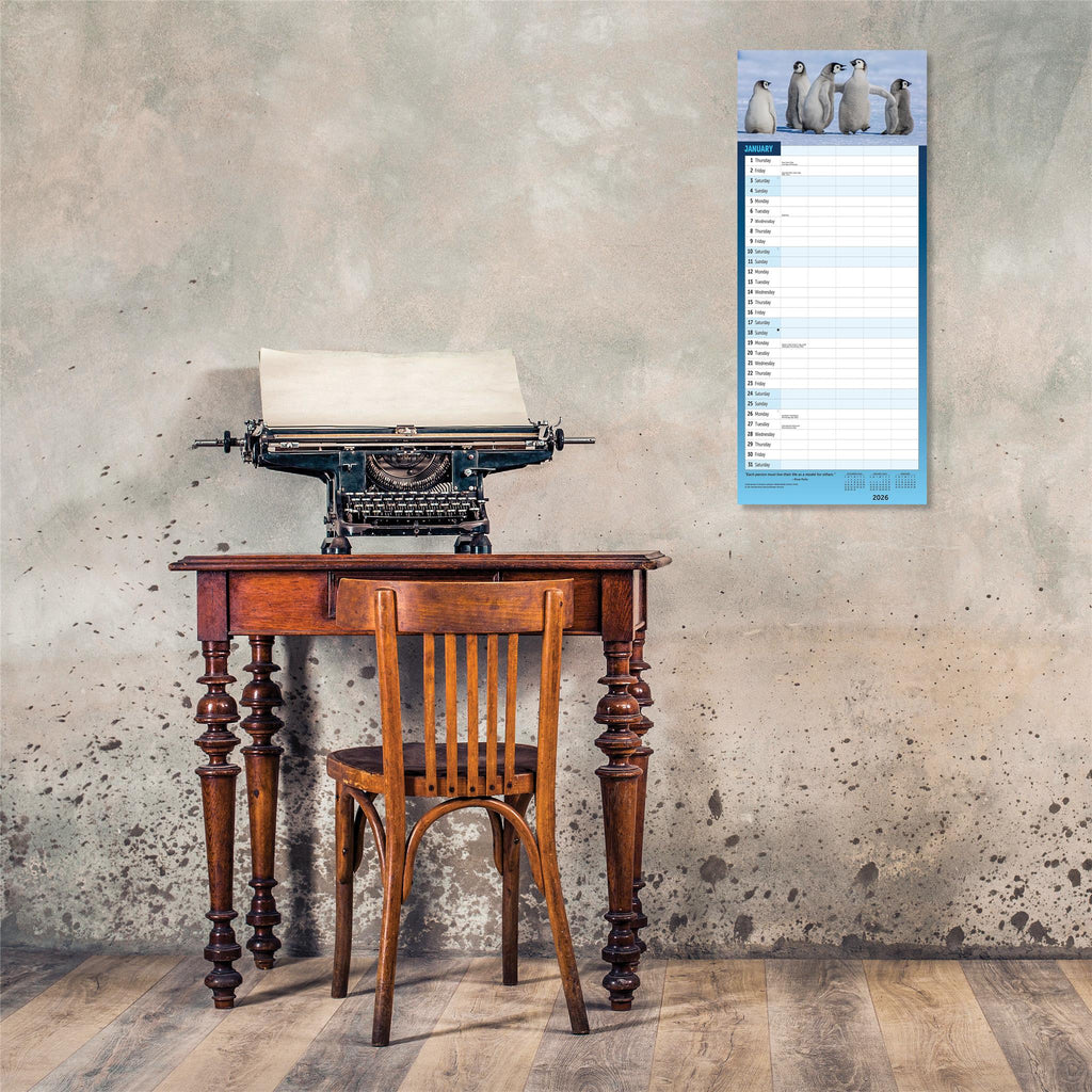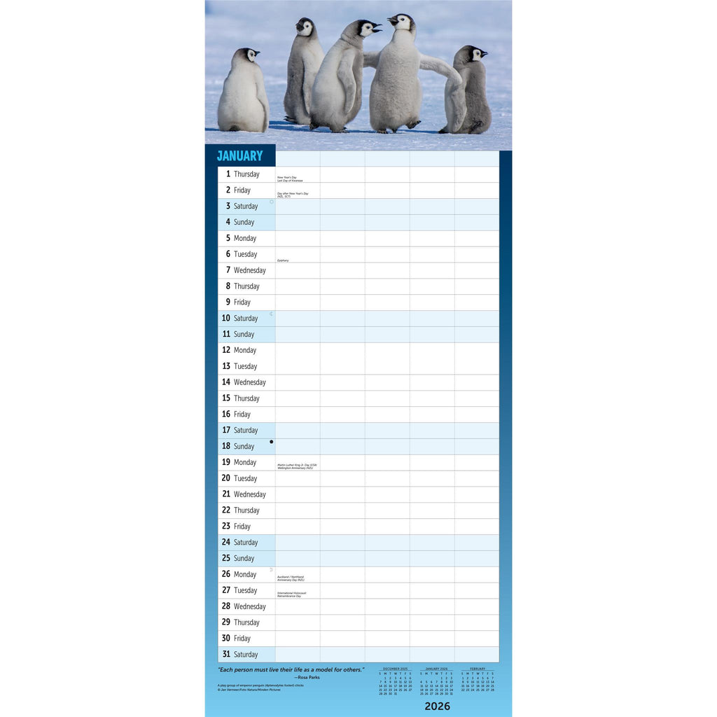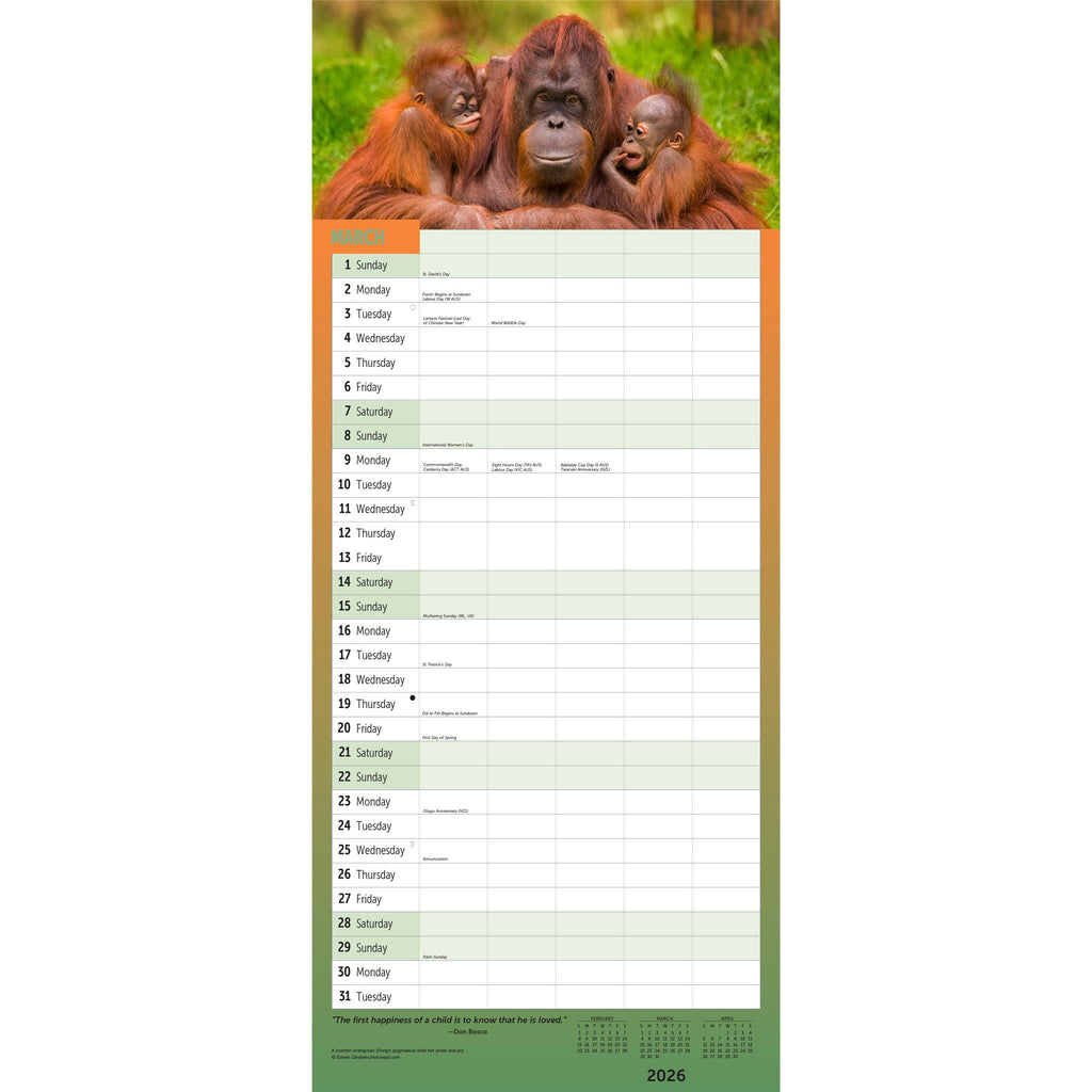 Déplié en format vertical de 71 cm (28 pouces), ce calendrier à compléter offre un espace généreux aux familles actives d'aujourd'hui pour noter les événements spéciaux, les anniversaires, les rendez-vous, les cours, les vacances, les tournois et autres activités importantes. Chacun dispose de sa propre section : impossible d'oublier une date ! De charmantes illustrations d'animaux et des citations inspirantes nous rappellent que chaque jour passé avec nos proches est un cadeau.