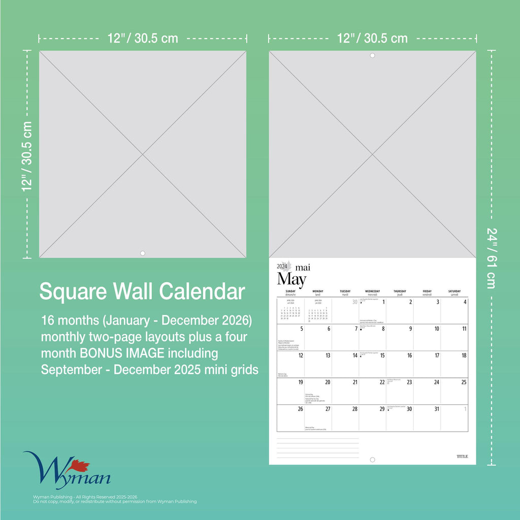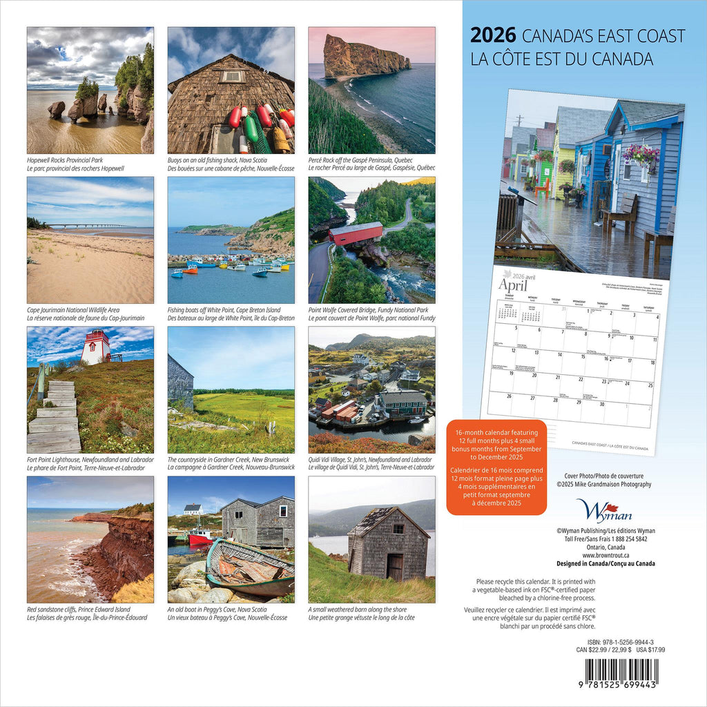 Que vous soyez un randonneur passionné, un grimpeur intrépide, un adepte des sports nautiques ou un promeneur contemplatif sur la plage, la côte est du Canada a forcément un endroit pour vous. Ce calendrier mural carré anglais vous ravira tout au long de l'année.