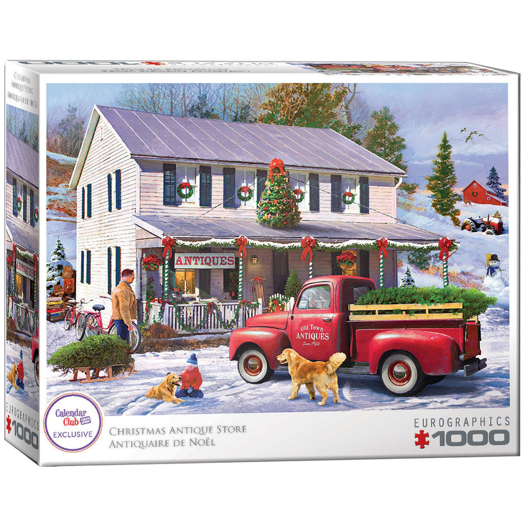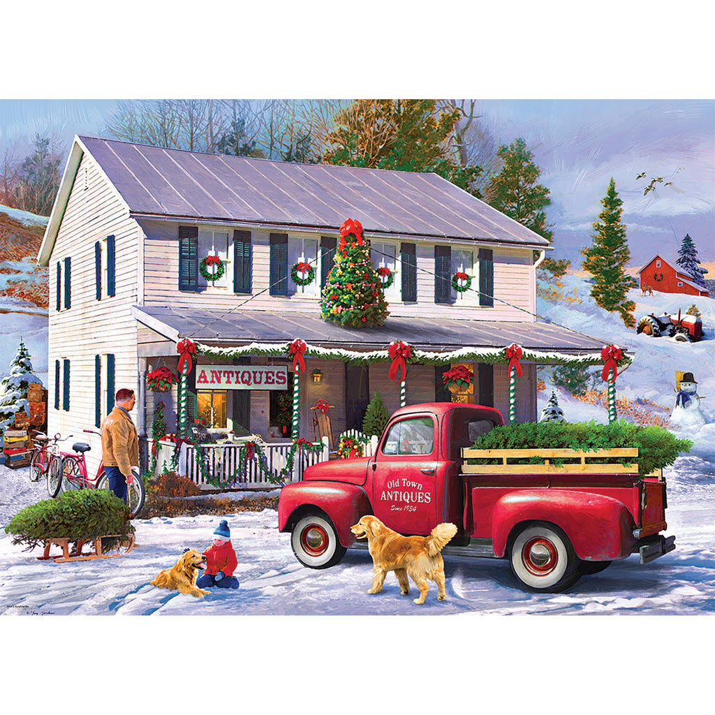 Décorations de Noël dans le magasin d'antiquités du coin. Image de saison avec une camionnette rouge vintage, un garçon et son chien qui jouent pendant que leur père les observe.