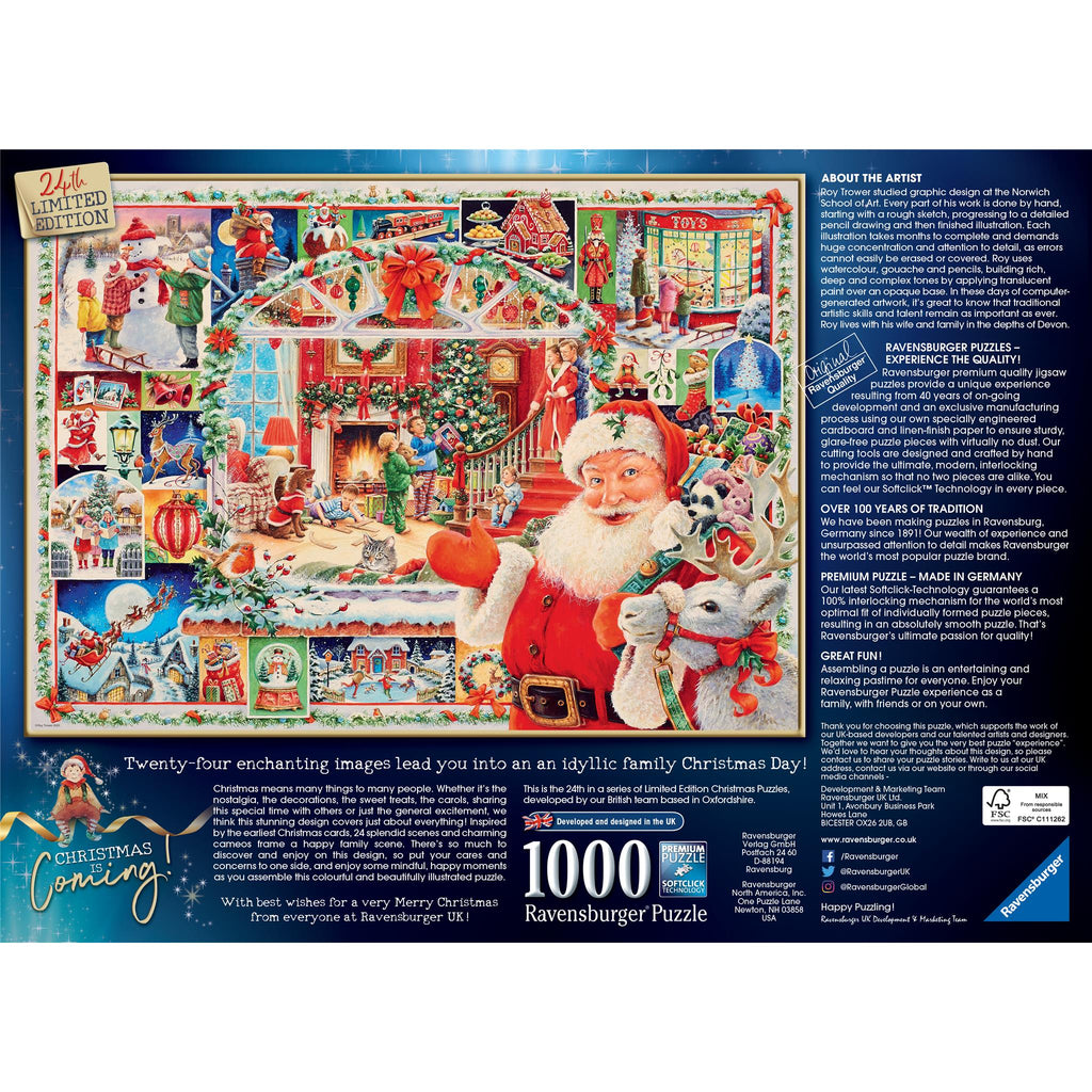 Prenez le temps de vous détendre pendant les fêtes grâce à un collage coloré de scènes chaleureuses dans notre puzzle lumineux et joyeux « Noël approche » ! Offrez-vous un moment de calme bien mérité pendant la période chargée des fêtes avec notre amusant puzzle « Noël approche » ! Commencez-le juste après Thanksgiving et, chaque jour, faites une petite pause dans votre emploi du temps déjà surchargé pour assembler quelques pièces. Faire des puzzles a des bienfaits prouvés sur la santé. Ils aident à détendre l'esprit, à améliorer la mémoire à court terme et les capacités de résolution de problèmes — exactement ce dont vous avez besoin en cette période frénétique de l'année. Joyeuses fêtes ! Ce puzzle de 1 000 pièces combine des images captivantes avec des pièces aux découpes nettes et l'emboîtement parfait de Ravensburger pour une expérience de puzzle des plus agréables ! Nos puzzles sont fabriqués avec un support extra-épais et un papier de qualité supérieure à la structure lin, pour une image imprimée éclatante, nette et sans reflets. Créez des moments inoubliables avec les puzzles haut de gamme Ravensburger ! Amusant à partir de 14 ans ! Dimensions approximatives : 70 x 50 cm une fois terminé.