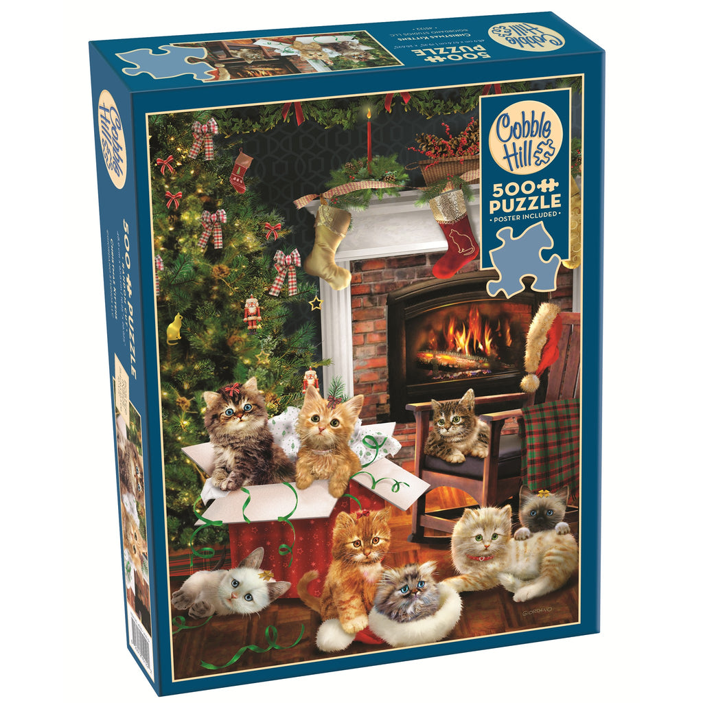 C'est le matin de Noël et les chatons ont joué toute la nuit. Le sapin décoré est toujours paré de ses ornements. Quelques adorables chatons se sont réfugiés dans une boîte, tandis que les autres se prélassent sur le sol et sur un fauteuil, réchauffés par le crépitement du feu de cheminée. Ce puzzle de 500 pièces évoque la magie des fêtes. Les puzzles Cobble Hill proposent des pièces aux formes variées et originales, ce qui rend chaque puzzle unique. Un poster pratique est inclus.