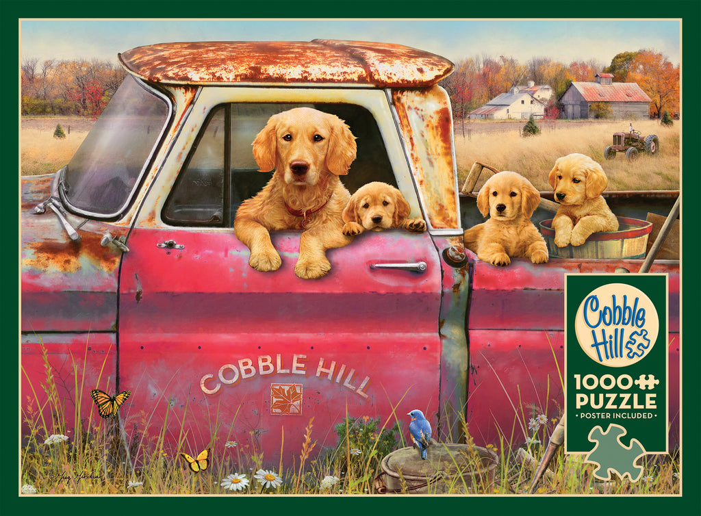 La ferme de Cobble Hill est encore plus adorable ! Une meute de chiots et leur maman attendent leur tour dans le vieux camion rouillé. Oiseaux et papillons observent avec curiosité l'excitation de ce puzzle de 1 000 pièces, illustré par Greg Giordano, l'artiste le plus populaire de Cobble Hill. Les puzzles Cobble Hill sont composés de pièces aux formes aléatoires originales : aucune n'est identique. Un poster pratique est inclus.
