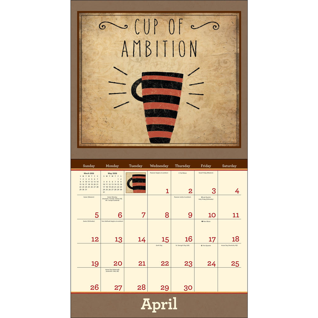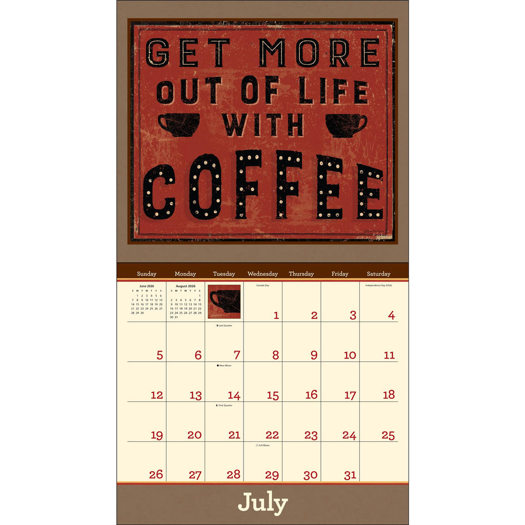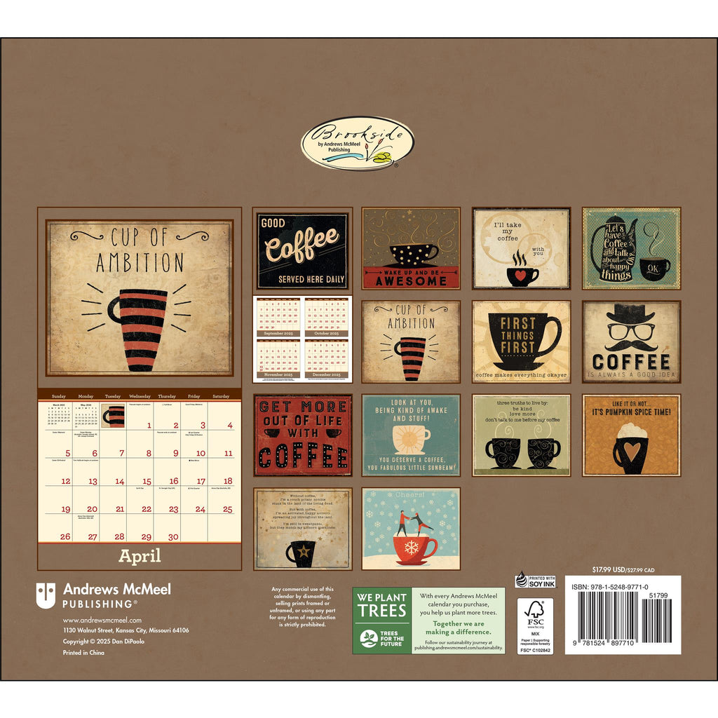 Comme le souligne avec élégance le calendrier mural de luxe Coffee 2026 de Dan DiPaolo, aucune décision importante ne devrait être prise avant votre première tasse de café. Accrochez ce calendrier luxueux, imprimé sur un papier texturé lin, à un endroit où vous le verrez chaque matin et ne serez plus jamais pris au dépourvu. Caractéristiques : 34,3 cm x 30,5 cm (34,3 cm x 61 cm ouvert). Enveloppe assortie sans plastique. Trou renforcé pour la suspension. Imprimé sur du papier certifié FSC® avec de l’encre à base de soja. Planification de septembre à décembre 2025. Couvre janvier à décembre 2026. Grille généreuse pour vos événements, rendez-vous et rappels. Jours fériés et commémorations officiels. Phases de la lune, selon le Temps Universel Coordonné. Chaque mois, une illustration artisanale évoque la joie de vivre et l’énergie d’une cafetière fraîchement préparée.
