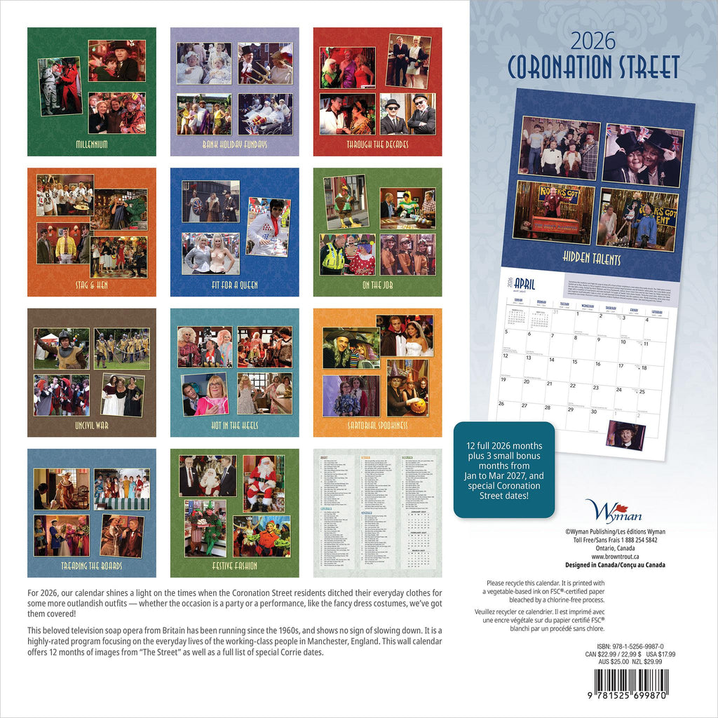 Ce feuilleton britannique culte est diffusé depuis les années 1960 et ne montre aucun signe de ralentissement. C'est une émission très populaire qui raconte le quotidien des classes populaires de Manchester, en Angleterre. Ce calendrier mural anglais propose 12 mois d'images de « Coronation Street » ainsi qu'une liste complète des dates importantes !
