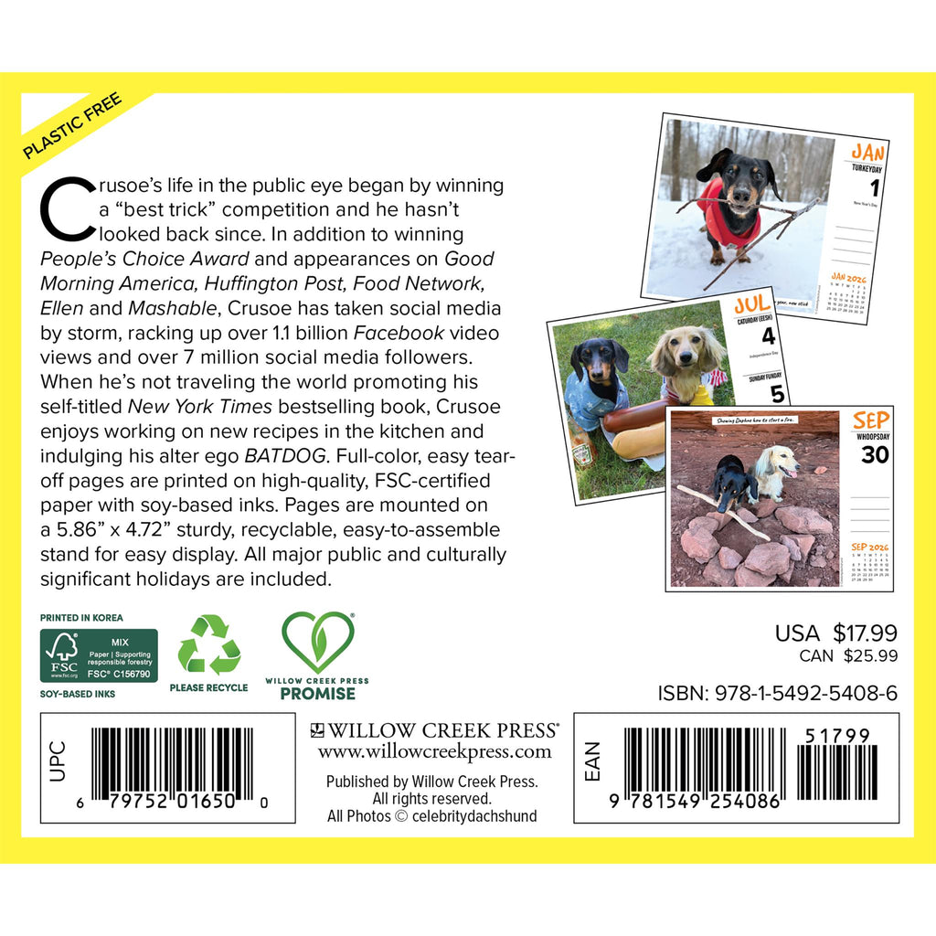 Crusoe, alias le teckel hors pair, est célèbre pour ses tenues extravagantes et ses vidéos virales cumulant plus de 50 millions de vues ! Petit par la taille, mais grand par le caractère, il est connu pour sa personnalité excentrique, aventurière et espiègle. Outre ses apparitions dans des émissions comme Ellen, Good Morning America, Food Network et Mashable, Crusoe a conquis les réseaux sociaux, rassemblant plus de 2 millions d'abonnés sur Facebook et Instagram, et remportant récemment le Shorty Award du Meilleur Animal de 2017. Les plus de 300 photos en couleur de ce calendrier quotidien célèbrent tout le charme de ce teckel populaire. Le calendrier journalier 2026 de Willow Creek Press (15,7 x 13,7 cm) est idéal pour la maison ou le bureau. Son petit format permet de le placer facilement et son contenu, rempli de citations inspirantes et de séquences amusantes, est parfait pour apporter une touche de fantaisie et de personnalité. Découvrez une nouveauté chaque jour pendant toute l'année et faites de votre bureau l'objet de toutes les conversations ! CADEAU IDÉAL - Dites adieu aux casse-têtes du cadeau avec notre calendrier journalier 2026 (15,7 x 13,7 cm). Parfait pour toutes les occasions spéciales, c'est le cadeau idéal pour vos proches. Ce calendrier est conçu pour rendre chaque année unique. IMAGES EXCEPTIONNELLES - Notre calendrier de bureau quotidien offre des images, des illustrations et des citations éclatantes et de haute qualité, en couleur. Appréciez des designs lumineux et dynamiques pour égayer votre journée. FORMAT DU CALENDRIER - Au format 15,7 x 13,7 cm, les pages sont montées sur un support robuste, recyclable et facile à assembler, pour une présentation aisée sur votre bureau ou votre table. ÉCO-RESPONSABLE - Willow Creek Press s'engage pour l'environnement et la durabilité de ses produits. Nos calendriers de bureau quotidiens sont imprimés en couleur, avec des pages détachables faciles, sur du papier certifié FSC de haute qualité, avec des encres à base de soja. PÉRIODE DE VALEUR - Calendrier journalier 2026, janvier 2026 - décembre 2026. BONUS - Le calendrier journalier 2026 inclut tous les principaux jours fériés et fêtes culturelles importantes.