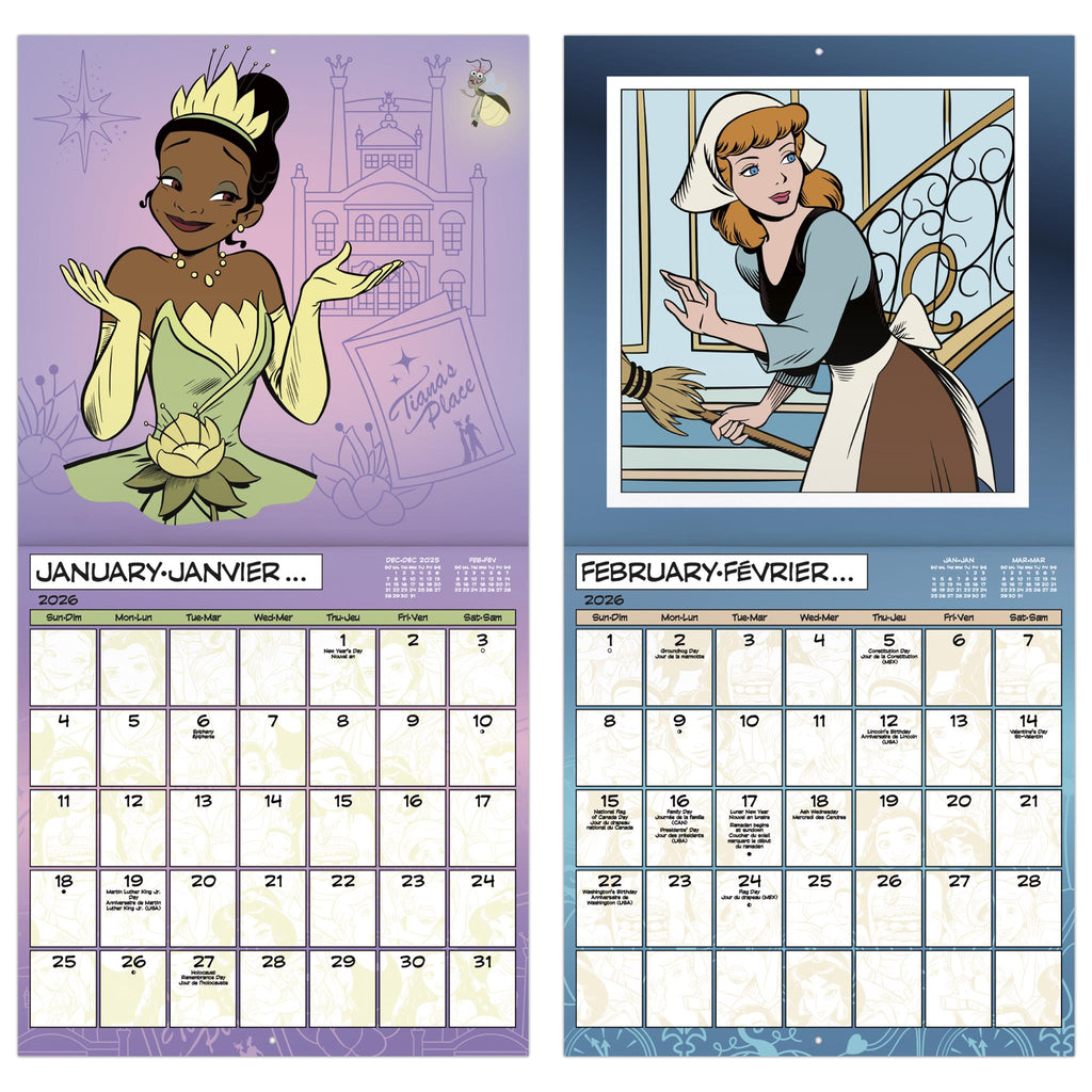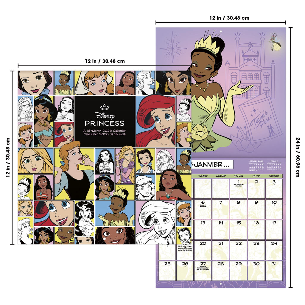 Vous êtes maître de votre destin ; nul besoin de magie, mais vous avez besoin du calendrier des Princesses Disney 2026. À votre image, elles sont fortes, belles, intemporelles et pleines de ressources, et vous guideront et vous inspireront tout au long de l’année. Ce calendrier mural de seize mois présente des pages mensuelles de janvier à décembre 2026, ainsi qu’une page regroupant les quatre derniers mois de 2025. Chaque page mensuelle inclut les jours fériés et les phases de la lune, avec suffisamment d’espace pour noter vos tâches et rendez-vous et ainsi vous aider à rester organisé(e). Il comprend 13 images de haute qualité imprimées sur du papier premium certifié FSC (Forest Stewardship Council). Idéal pour décorer un mur, un tableau d’affichage ou un panneau d’affichage à la maison, à l’école ou au bureau.