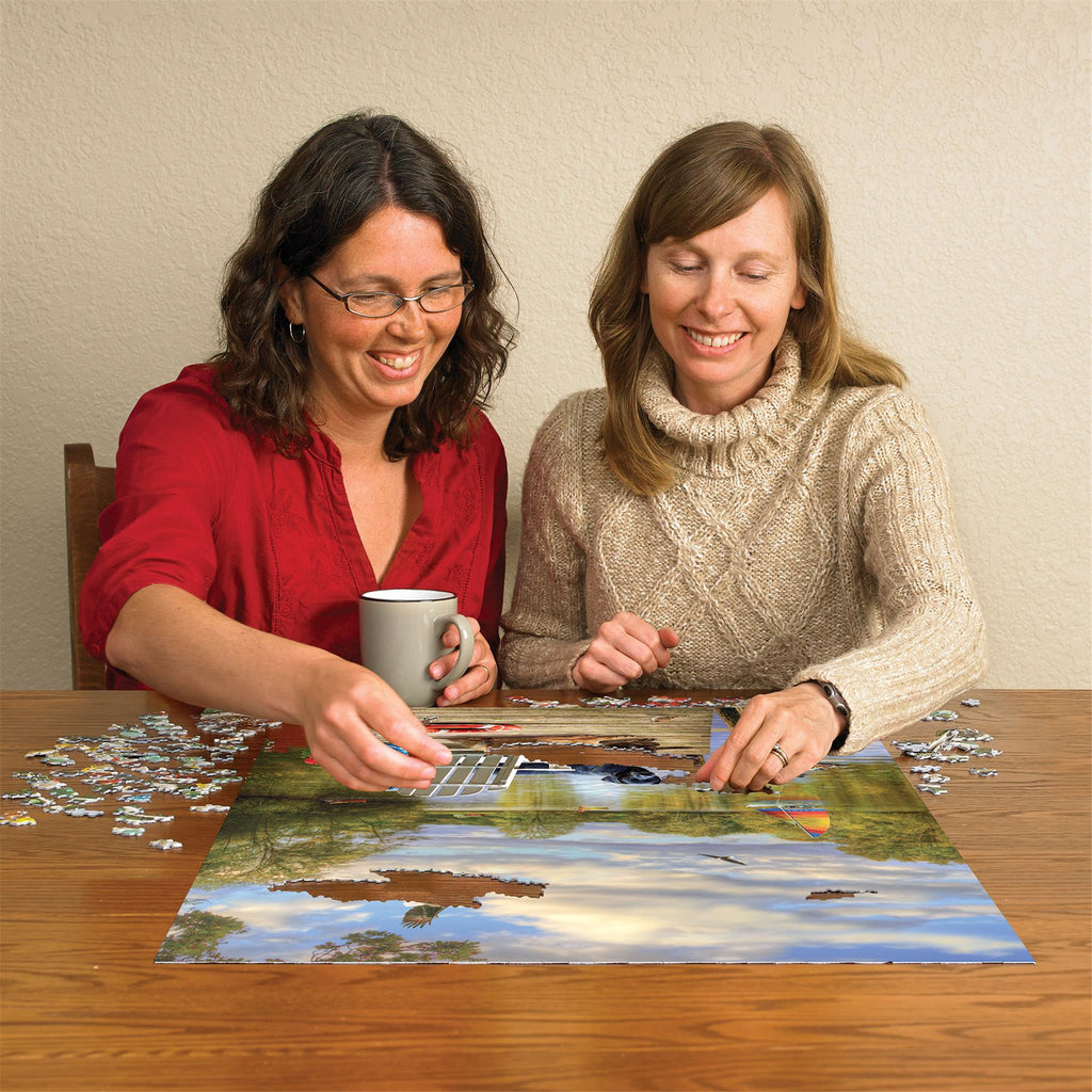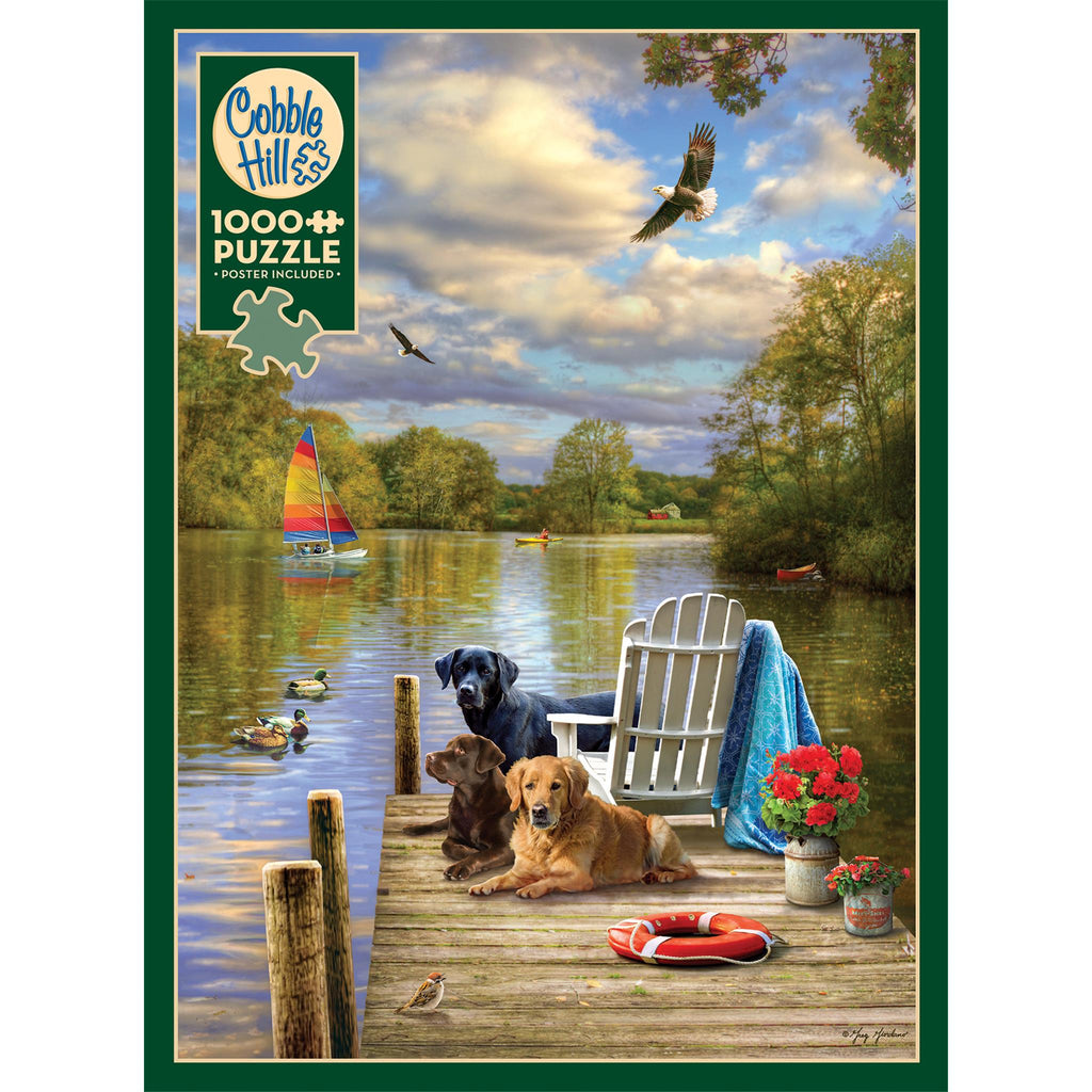 Les trois amis attendent patiemment sur le quai pour jouer à la balle dans le lac. Les canards, bien à l'abri dans l'eau, ne font qu'attiser leur curiosité. Ce puzzle de 1 000 pièces regorge d'oiseaux, de bateaux, de soleil et de journées paisibles au bord du lac. Les puzzles Cobble Hill sont composés de pièces aux formes variées et originales, ce qui les rend tous uniques. Un poster pratique est inclus.