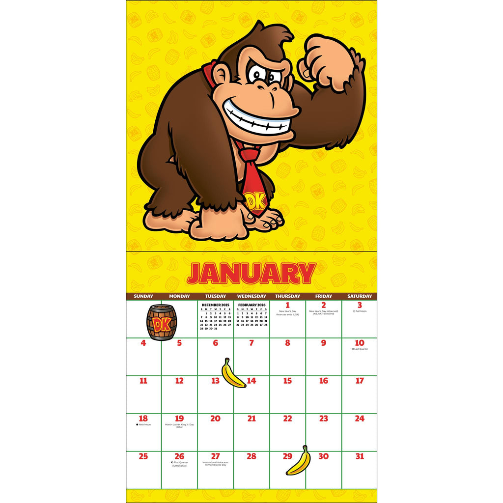 Cassez des tonneaux et déchaînez-vous avec Donkey Kong et ses amis grâce à ce calendrier mural de 12 mois. Avec ses illustrations dynamiques tirées de la série de jeux vidéo Nintendo, ce calendrier 2026 est idéal pour les fans de la première heure comme pour les nouveaux venus qui souhaitent explorer les îles et se balancer dans la jungle en compagnie de personnages emblématiques tels que Donkey Kong, Diddy Kong, Dixie Kong et Cranky Kong. Caractéristiques : 30,5 cm x 30,5 cm (30,5 cm x 61 cm ouvert). Imprimé sur du papier certifié FSC® avec de l’encre à base de soja. Planification de septembre à décembre 2025. Couvre janvier à décembre 2026. Grand espace quadrillé pour vos notes, rendez-vous et rappels. Jours fériés et commémorations officiels. Phases de la lune (UTC). Images saisissantes des jeux vidéo Donkey Kong.