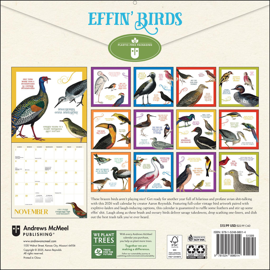 Chaque double page mensuelle de ce calendrier mural véritablement cathartique présente des illustrations d'oiseaux vintage accompagnées de tirades fleuries d'oiseaux effrontés, prêts à semer la zizanie et à provoquer. Préparez-vous à rire avec ces trublions à plumes qui débitent des répliques irrévérencieuses et des joutes verbales vulgaires, mais toujours pertinentes, à chaque saison de l'année. Caractéristiques : 30,5 cm x 30,5 cm (30,5 cm x 61 cm ouvert). Couverture sans emballage plastique. Imprimé sur papier certifié FSC® avec de l'encre à base de soja. Double page pour la période de septembre à décembre 2025. Couvre la période de janvier à décembre 2026. Grand espace quadrillé pour les rendez-vous, les notes et les rappels. Jours fériés et commémorations officiels. Phases de la lune, selon le Temps Universel. Chaque double page mensuelle présente des illustrations d'oiseaux vintage accompagnées de phrases fleuries.