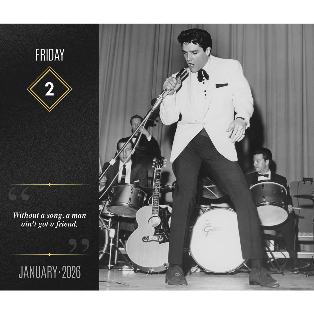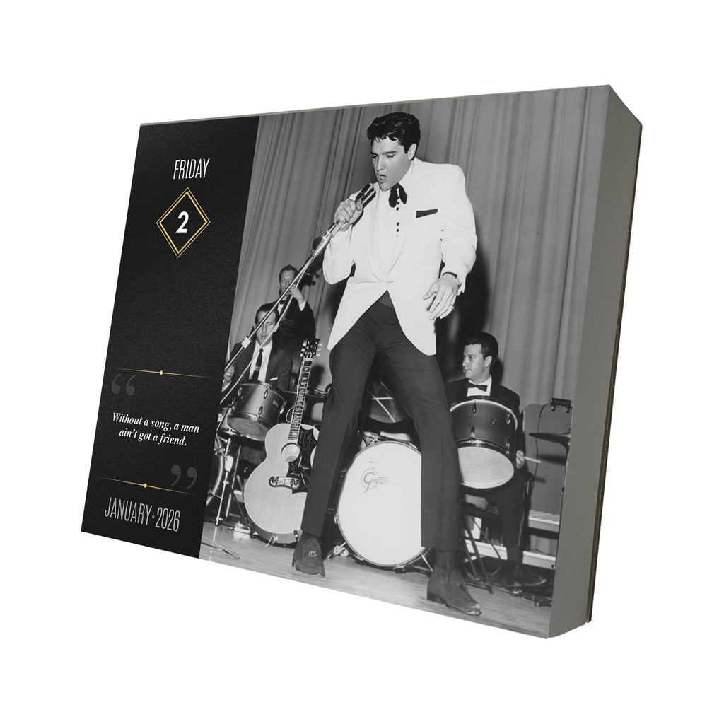 Vous pensez tout savoir sur le Roi du Rock and Roll ? Ce calendrier Elvis Presley 2026 vous propose 365 jours de photos et de citations pour tester vos connaissances sur l'inimitable Elvis Presley. Le cadeau idéal pour un proche, ou pour vous-même. Ce calendrier, présenté dans une case, contient plus de 300 pages détachables en couleur, avec des illustrations uniques pour chaque jour de l'année (les pages du week-end sont regroupées pour les samedis et dimanches). Il indique les jours fériés et les phases de la lune pour une organisation optimale. Un chevalet écologique et sans plastique est inclus pour une présentation facile sur votre bureau, votre table ou une étagère, à la maison, à l'école ou au bureau.