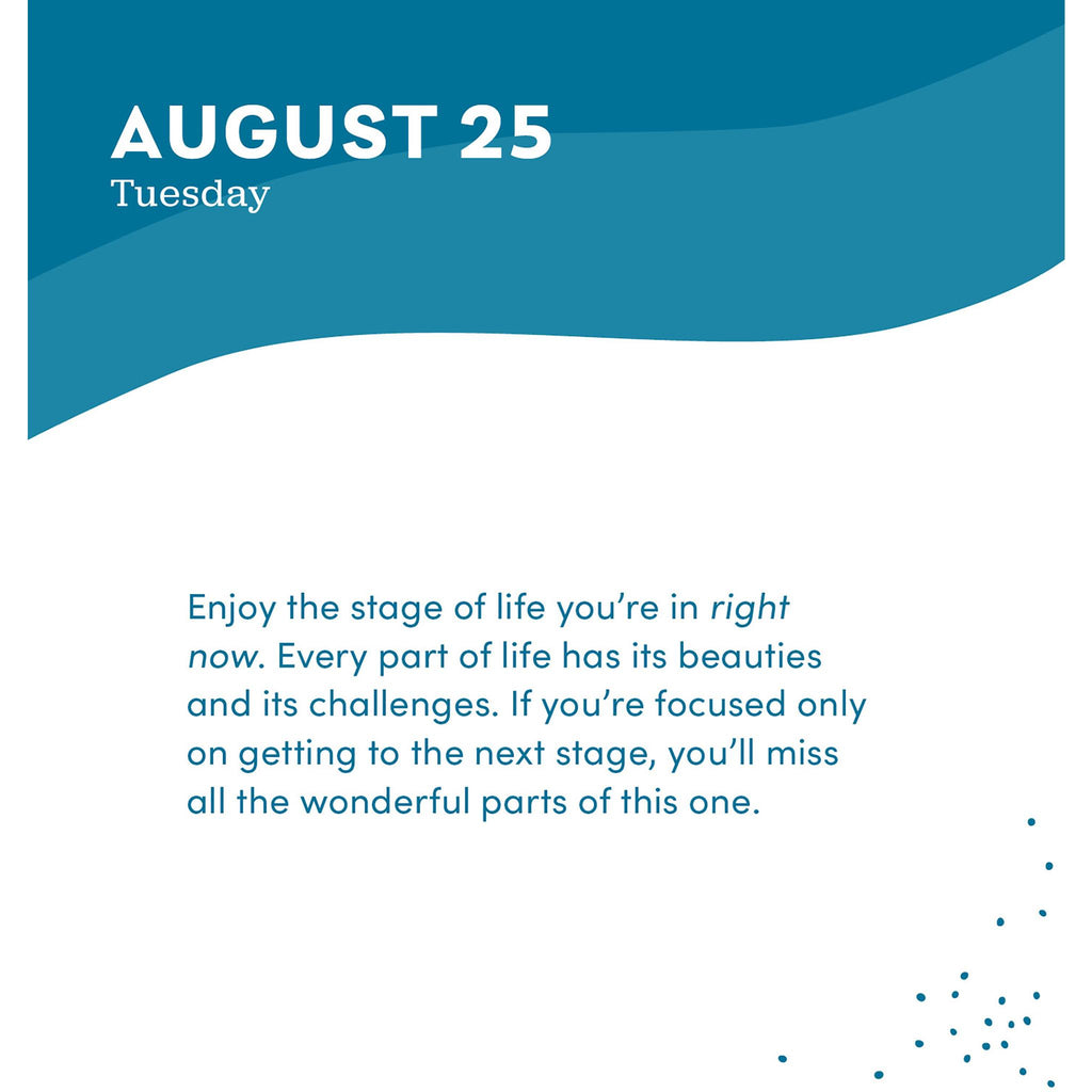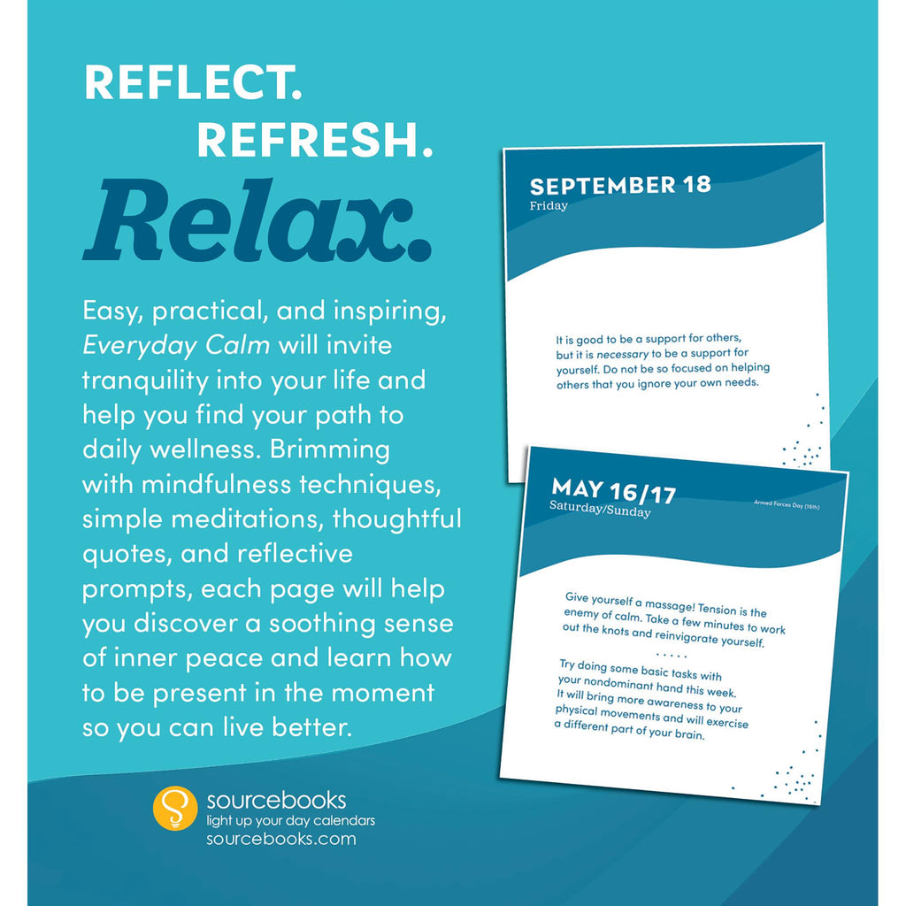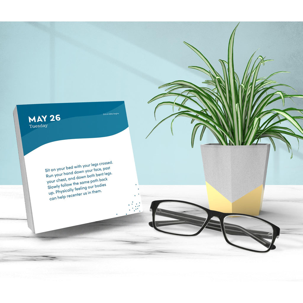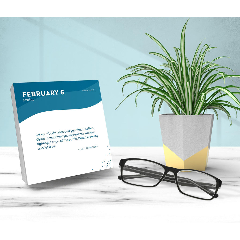 Cultivez la sérénité au quotidien grâce à ce calendrier de bureau inspirant et prenez le temps de réfléchir, de vous ressourcer et de vous détendre cette année. Simple, pratique et inspirant, ce calendrier de pleine conscience quotidien invitera la tranquillité et la positivité dans votre vie et vous guidera vers un bien-être quotidien. Regorgeant de techniques anti-stress, de méditations simples, de citations inspirantes et d'invitations à la réflexion, chaque page de ce calendrier 2026 vous aidera à prendre soin de votre santé mentale, à cultiver la gratitude, à découvrir une paix intérieure apaisante et à apprendre à vivre pleinement le moment présent. Il est temps de respirer, de retrouver le calme et de vivre mieux ! Ce calendrier apaisant et stimulant vous invite à ralentir le rythme et constitue le cadeau idéal pour prendre soin de vous et soulager l'anxiété, un cadeau hygge inspirant et porteur de sens pour vos proches, ou tout simplement un plaisir à s'offrir. Format 12 x 12,5 cm avec étui de protection. 100 % recyclable et sans plastique, sans emballage rétractable ! Support chevalet en carton pour une présentation parfaite sur une table ou un bureau. Papier écologique certifié FSC. Calendrier quotidien avec pages détachables faciles présentant 365 façons de se détendre, de décompresser et d'améliorer son estime de soi. Jours fériés et célébrations.