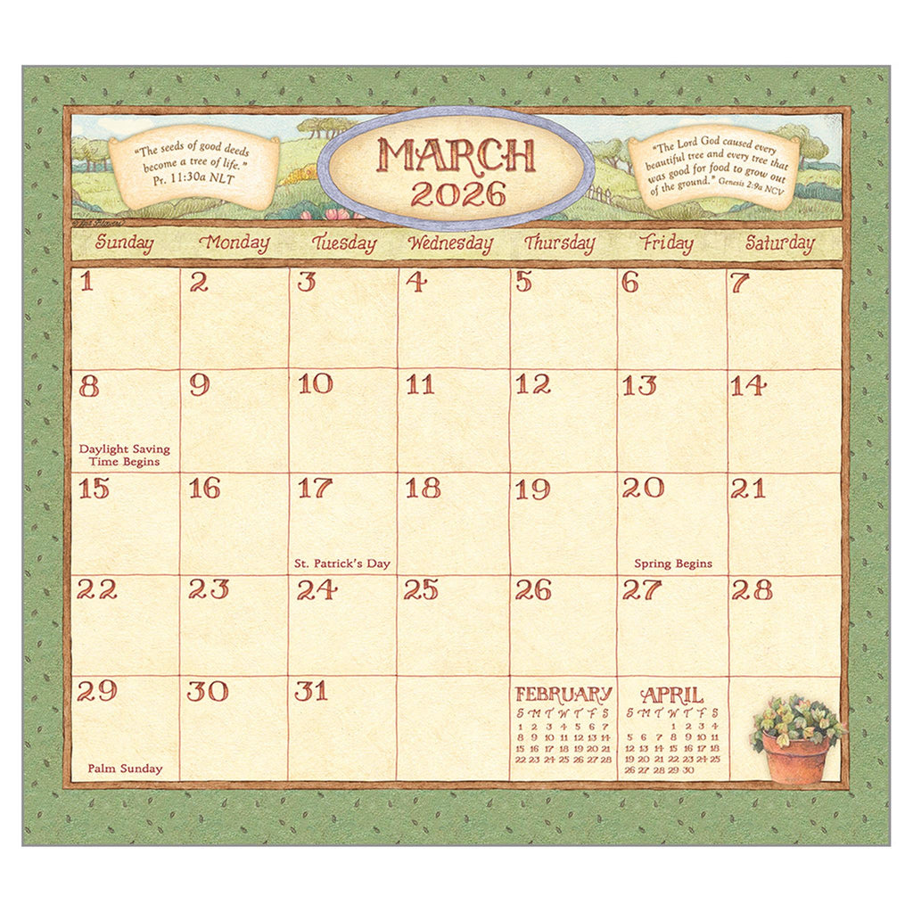 Ce calendrier mural Legacy 2026 présente les douces illustrations champêtres de l'artiste Lisa Blowers, accompagnées de versets bibliques inspirants. Chaque calendrier de 12 mois est imprimé sur un papier haut de gamme gaufré lin, offrant un toucher luxueux et raffiné, et est livré dans une pochette de protection. Le bloc-dates est conçu spécifiquement pour chaque calendrier, en harmonie avec les illustrations. La dernière page contient un calendrier sur deux ans (2026/2027) et un espace pour les notes. Un renfort en laiton sur la couverture assure une meilleure durabilité.