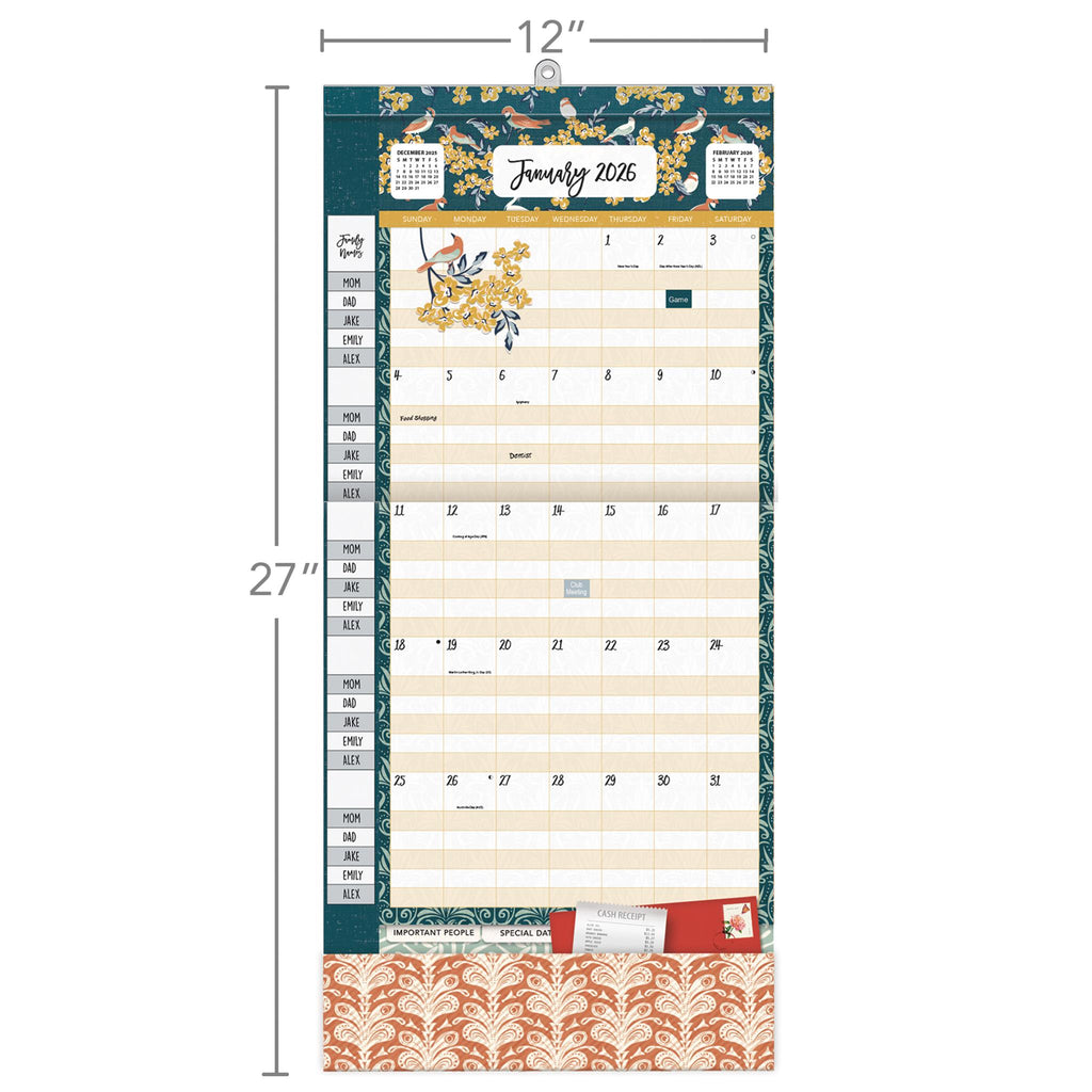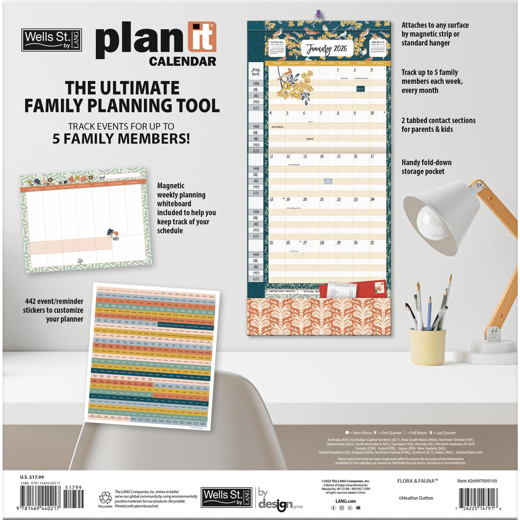 Le calendrier Flora & Fauna 2026 Plan-It Plus vous permettra d'organiser votre famille grâce à sa grille de 17 mois comprenant 5 rangées individuelles pour chaque membre de la famille, 442 autocollants de rappel et un tableau blanc magnétique pour la planification. Chaque mois est agrémenté d'une illustration magnifique et fantaisiste signée Heather Dutton.