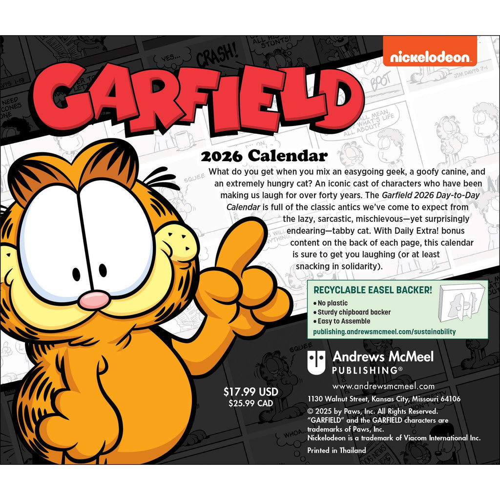 Il n'y a rien de plus parlant que d'adorer les lasagnes et de redouter les lundis, n'est-ce pas ? D'après le calendrier Garfield 2026, ce sont les moments les plus importants de la vie. Avec une BD Garfield différente chaque jour et du contenu bonus quotidien, vous pourrez passer l'année à râler et à faire la sieste en compagnie du célèbre chat tigré. Caractéristiques : Format : 13,7 x 11,4 cm. Sans plastique à usage unique. Support chevalet en carton recyclable pour une présentation sur un bureau ou une table. Imprimé sur du papier certifié FSC® avec de l'encre à base de soja. Pages détachables en couleur. Au verso, du contenu bonus quotidien : jeux, blagues, citations et anecdotes. Date et heure indiquées sur chaque page. Pages regroupant les week-ends. Jours fériés et commémorations officiels. Une BD d'une couleur différente chaque jour.