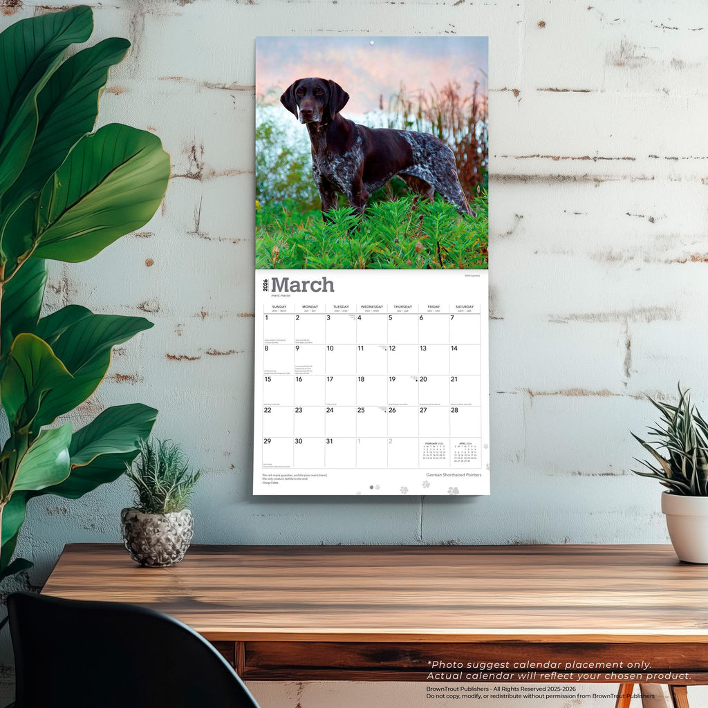 Que ce soit sur terre ou dans l'eau, le Braque allemand à poil court est toujours à la hauteur. Intelligents, amicaux et fidèles, ces chiens aiment profondément leur famille. Travailleurs enthousiastes, ils sont d'excellents chiens de chasse polyvalents. Célébrez cette race élégante et vive avec ce magnifique calendrier de Braques allemands à poil court. Ce produit est destiné aux consommateurs résidant aux États-Unis.