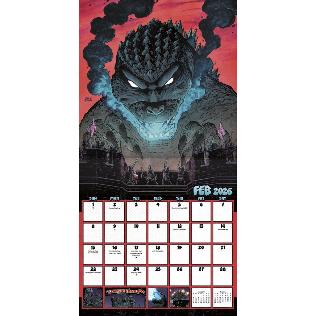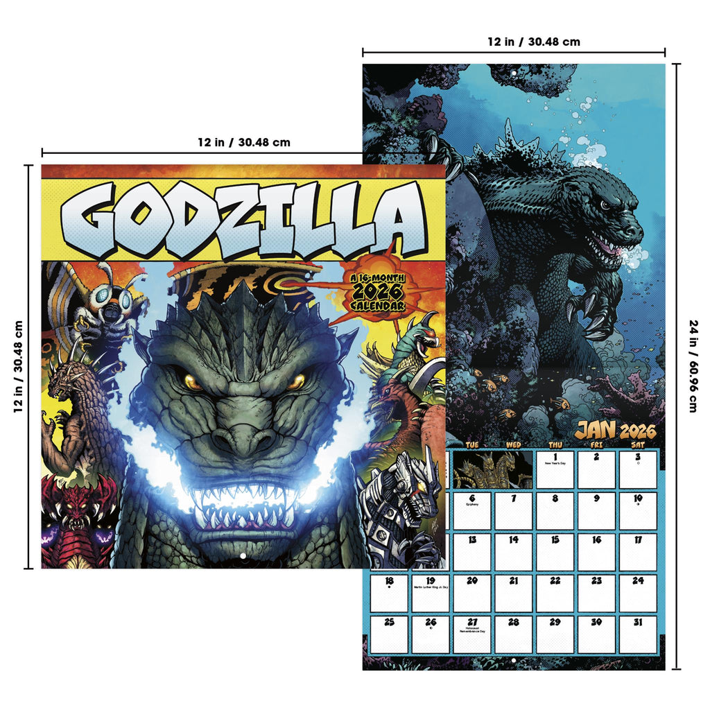 Tokyo est en danger après le réveil de Godzilla, une créature gigantesque, de son hibernation sous-marine suite à des essais nucléaires. Découvrez l'univers artistique du monstre le plus célèbre du monde dans le calendrier Godzilla 2026. Ce calendrier mural de seize mois présente des pages mensuelles de janvier à décembre 2026, ainsi qu'une page regroupant les quatre derniers mois de 2025. Chaque page mensuelle inclut les jours fériés et les phases de la lune, avec suffisamment d'espace pour noter vos tâches et rendez-vous et ainsi vous aider à rester organisé. Il comprend 13 images de haute qualité imprimées sur du papier premium certifié FSC (Forest Stewardship Council). Idéal pour décorer vos murs, tableaux d'affichage ou panneaux de liège, à la maison, à l'école ou au bureau.