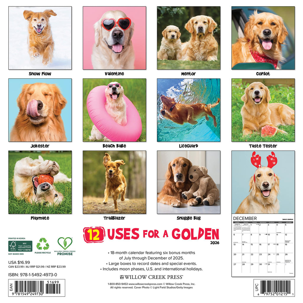 Les Golden Retrievers ne sont pas seulement de formidables compagnons et de magnifiques chiens ; ils sont aussi toujours prêts à rendre service à leurs maîtres. Parmi leurs talents insoupçonnés, on compte la conduite depuis le siège arrière, la fonction d'alarme, le chauffe-pieds, la dégustation de plats et bien plus encore. Ce calendrier grand format présente une année complète de photos en couleur illustrant avec humour les utilisations de ces merveilleux chiens. Organisez-vous pour l'année à venir avec le calendrier mural 2026 de Willow Creek Press (30,5 x 30,5 cm). Ses grandes cases permettent de noter facilement les dates et les événements, vous aidant ainsi à rester efficace et à respecter vos engagements. Laissez ce calendrier vous guider vers une année plus organisée, réussie et épanouissante. CADEAU IDÉAL : Ne cherchez plus le cadeau parfait pour toute occasion spéciale. Rendez l'année de quelqu'un inoubliable avec l'un de nos calendriers muraux 2026. Nos calendriers sont le choix idéal pour vos amis et votre famille, même pour ceux à qui il est difficile de faire un cadeau. PLANIFICATION : Restez organisé et inspiré tout au long de l'année. Calendrier idéal pour prendre des notes, noter les dates importantes, suivre les rendez-vous et organiser les activités familiales. IMAGES EXCEPTIONNELLES - Des images nettes et détaillées en couleur chaque mois, parfaites pour décorer vos murs à la maison, au bureau ou à l'école. GRANDES CASES - Format 30,5 x 30,5 cm (12 x 12 pouces), avec de grandes cases journalières offrant un espace d'écriture généreux. QUALITÉ SUPÉRIEURE - Papier de haute qualité qui reste bien à plat une fois accroché et offre des couleurs vives et éclatantes. VUE D'ENSEMBLE MENSUEL - Planifiez à l'avance ou consultez les mois précédents et à venir en un coup d'œil. ÉCOLOGIQUE - Willow Creek Press s'engage pour l'environnement et la durabilité de ses produits. Nos calendriers muraux 2026 (30,5 x 30,5 cm) sont imprimés avec des encres à base de soja sur du papier certifié FSC de haute qualité pour une écriture fluide. PÉRIODE - Calendrier mural 2026 avec 6 mois bonus de juillet à décembre 2025. FONCTIONNALITÉS SUPPLÉMENTAIRES - Jours fériés américains et internationaux et phases de la lune (heure centrale) indiqués pour chaque mois. Cette année peut être votre plus réussie à ce jour, avec ce beau