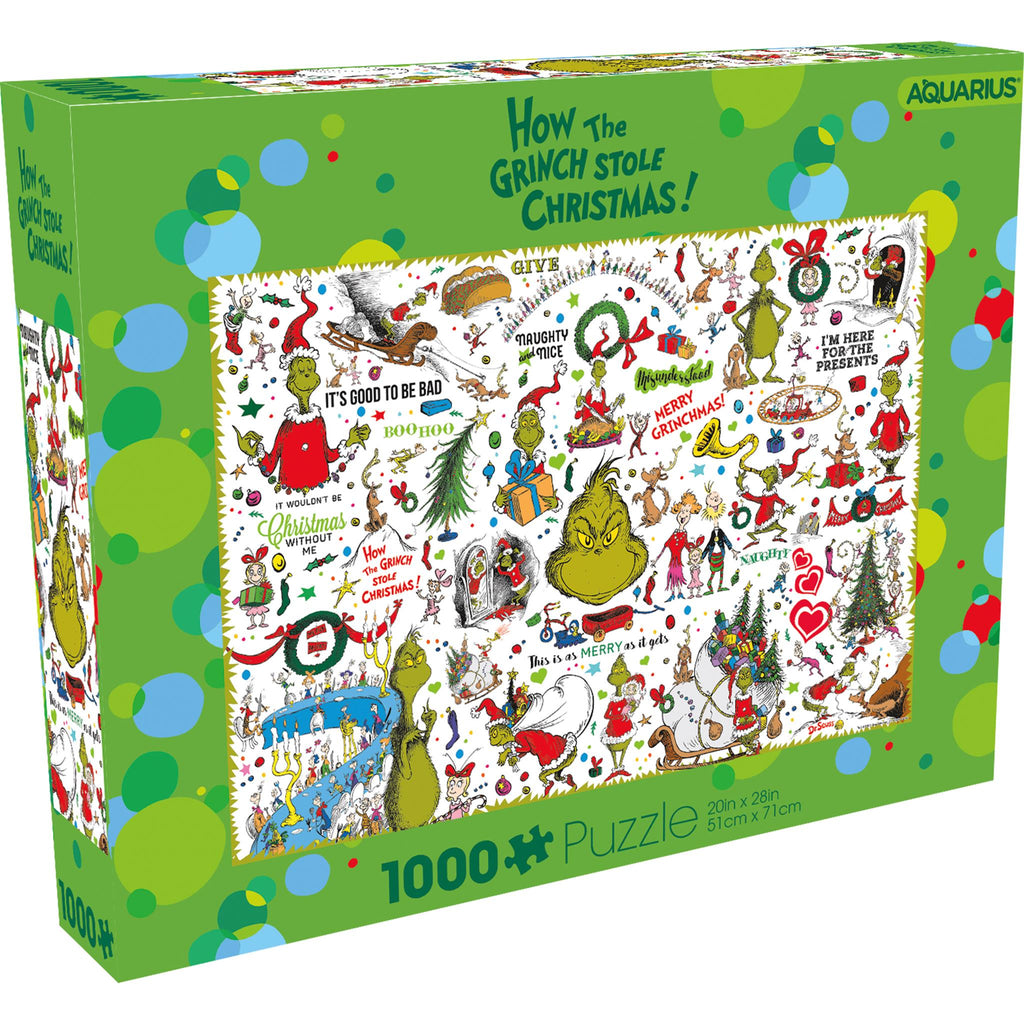 Savourez le mécontentement du Grinch en assemblant en famille ce puzzle collage de 1000 pièces représentant le Grinch et d'autres scènes de Whoville. Une fois terminé, le puzzle mesure 51 x 71 cm.