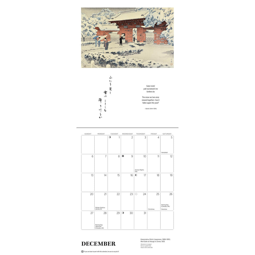 Forme poétique des plus pures, le haïku doit, en dix-sept syllabes, évoquer une saison et comporter une pause ou une interruption marquée. Les poèmes présentés ici – en calligraphie japonaise, en translittération romaji et en traduction anglaise – sont accompagnés de gravures sur bois d'artistes japonais du début du XXe siècle. Par leur profondeur et leur délicatesse, leur riche palette de nuances subtiles et leur représentation de bijin-ga (« images de belles personnes »), de paysages, d'oiseaux et de fleurs, ces élégantes estampes sont depuis longtemps appréciées en Orient comme en Occident.
