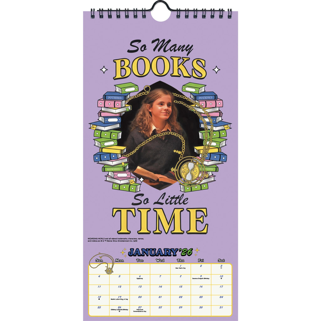 Du Quidditch aux Maunders et à leur carte du monde, Poudlard est l'école dont tout le monde rêve. Mais si vous n'avez pas reçu votre invitation, vous pouvez tout de même passer l'année à l'école de sorcellerie grâce au mini-calendrier Harry Potter 2026, orné d'illustrations célébrant la saga. Idéal pour les petits espaces, ce mini-calendrier de 16 mois comprend des pages mensuelles de janvier à décembre 2026, ainsi qu'une page regroupant les quatre derniers mois de 2025. Chaque page mensuelle indique les jours fériés et les phases de la lune. Les pages détachables et perforées se transforment en 13 posters muraux de haute qualité. La reliure spirale Wire-O est munie d'un crochet pour une suspension facile : parfait pour décorer votre mur, un tableau en liège ou votre casier, à la maison, à l'école ou au bureau.