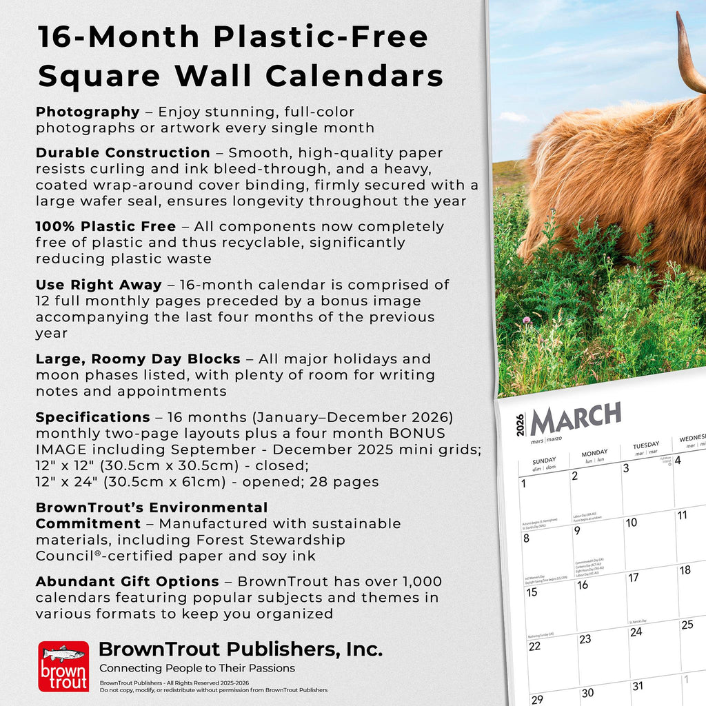 La vache Highland est une race bovine écossaise rustique. Originaire des Highlands et des îles de l'ouest de l'Écosse, elle possède des cornes et un long pelage ondulé et laineux aux couleurs variées. Ce pelage caractéristique la protège du froid en hiver et contribue à son allure magnifique, qui explique sa grande popularité. Ces vaches sont réputées pour leur douceur et leur affection pour les humains. Accueillez ces animaux attachants et photogéniques chez vous grâce à ce superbe calendrier.