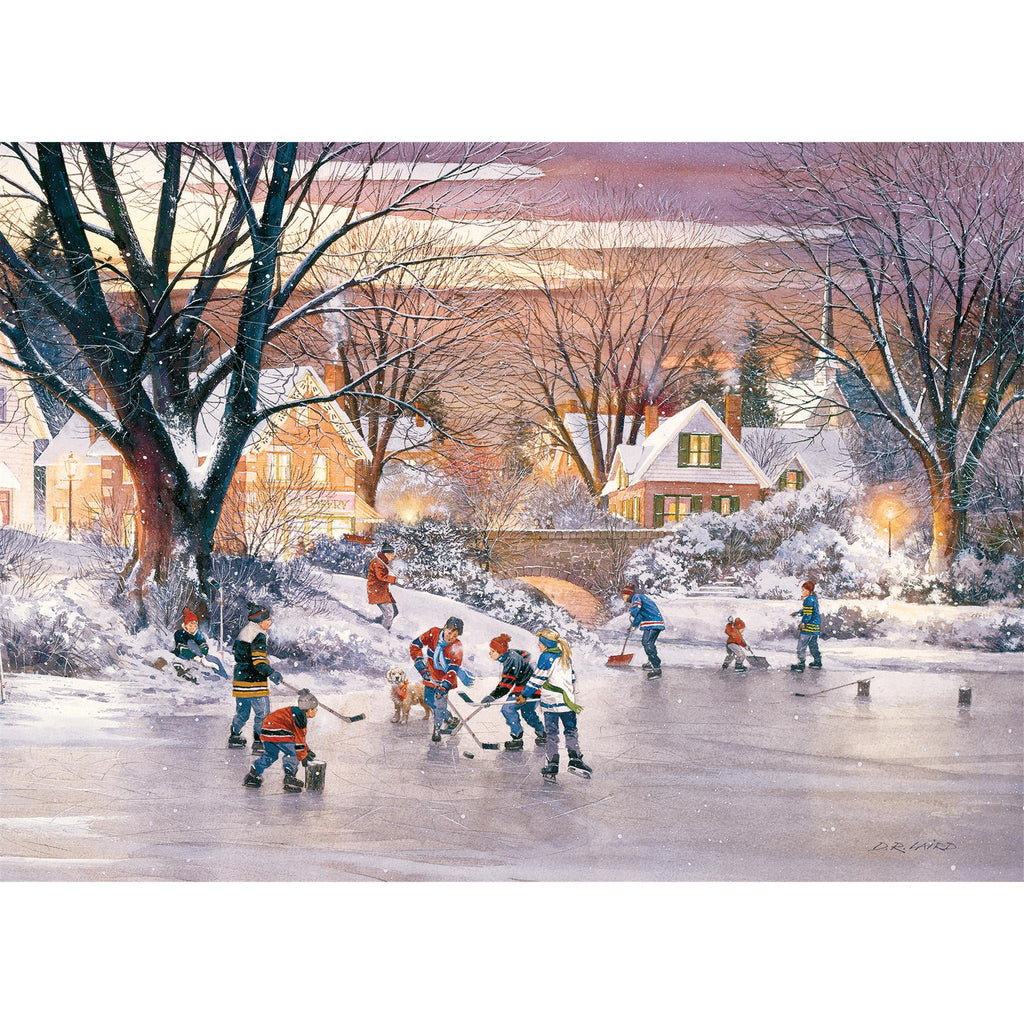 Par une froide soirée d'hiver, c'est le moment idéal pour jouer au hockey sur l'étang gelé. Tous les enfants du village ont enfilé leurs plus beaux maillots pour l'occasion. Ce puzzle de 1 000 pièces est rempli de hockey sur étang, de nez qui coulent, de chocolat chaud et de rêves de jouer dans la LNH. Les puzzles Cobble Hill sont composés de pièces aux formes aléatoires originales, ce qui les rend tous uniques. Un poster pratique est inclus.