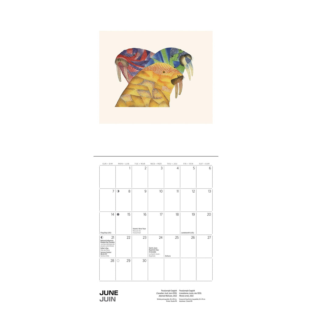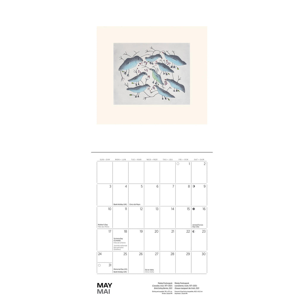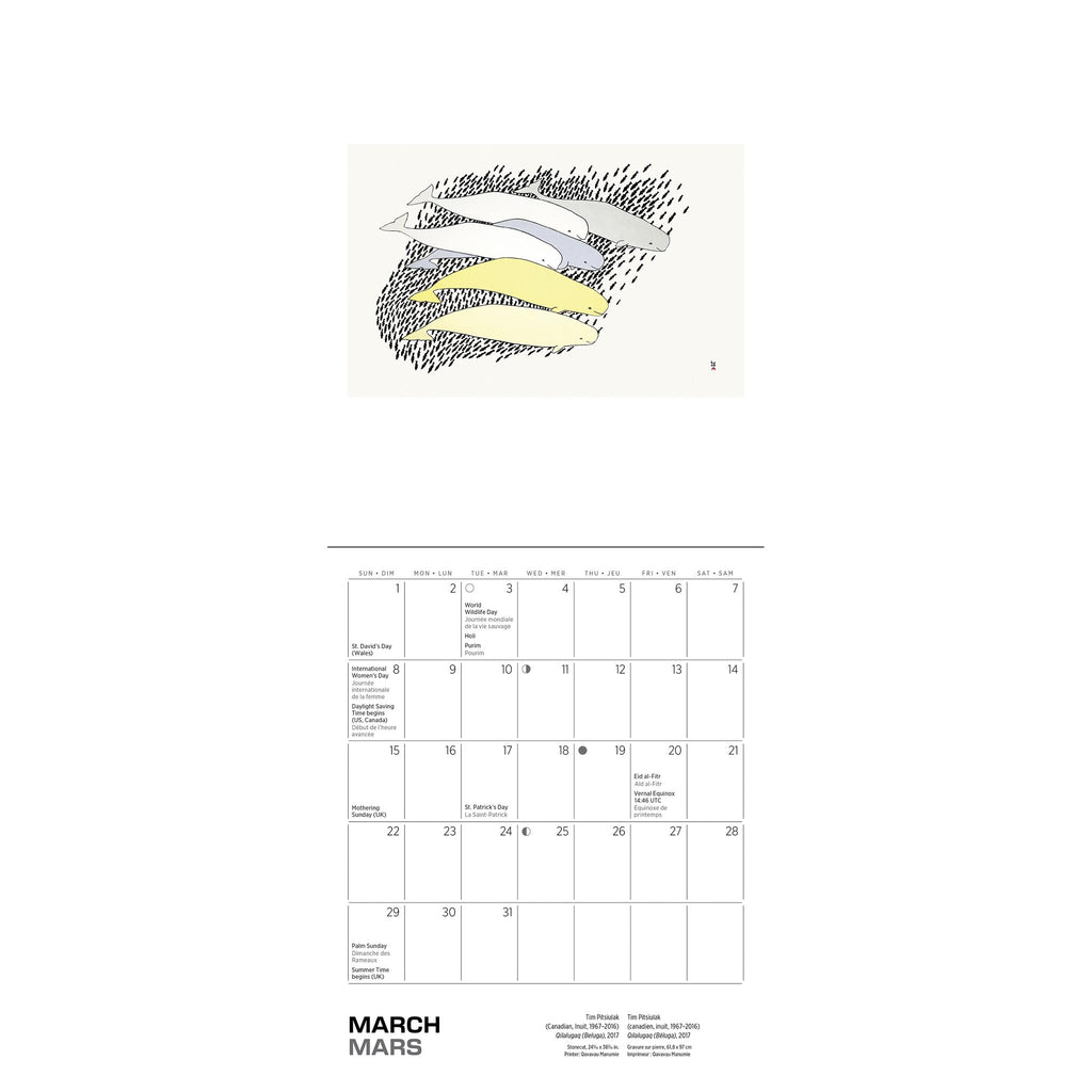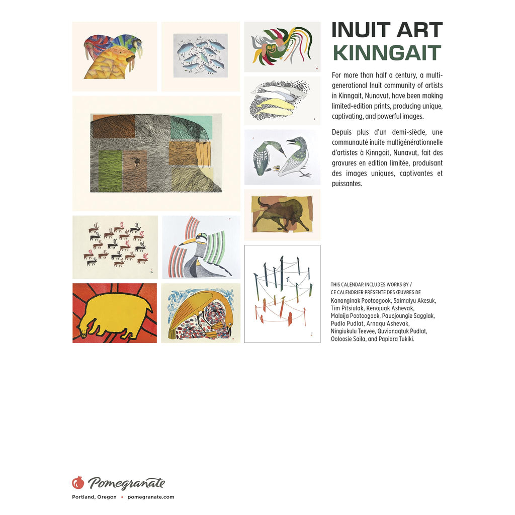 Dans la communauté arctique canadienne de Kinngait (Cape Dorset), au Nunavut, des artistes inuits réalisent des estampes en édition limitée depuis un demi-siècle. Douze de leurs œuvres ornent ce calendrier.