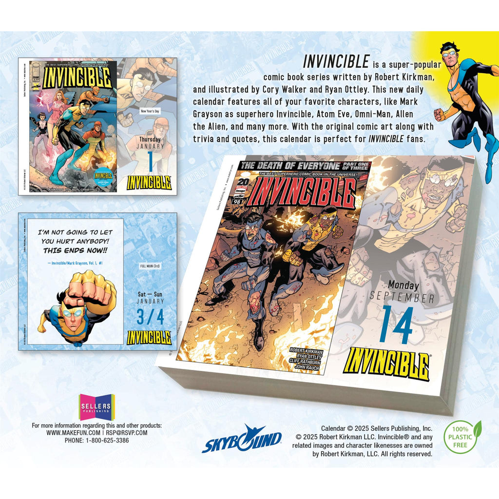 INVINCIBLE est une série de bandes dessinées à succès écrite par Robert Kirkman et illustrée par Cory Walker et Ryan Ottley. Ce nouveau calendrier quotidien met en scène tous vos personnages préférés, comme Mark Grayson alias Invincible, Atom Eve, Omni-Man, Allen l'extraterrestre et bien d'autres. Des illustrations originales, des anecdotes et des citations font de ce calendrier le cadeau idéal pour les fans d'INVINCIBLE. Il fait partie de notre collection de calendriers INVINCIBLE.
