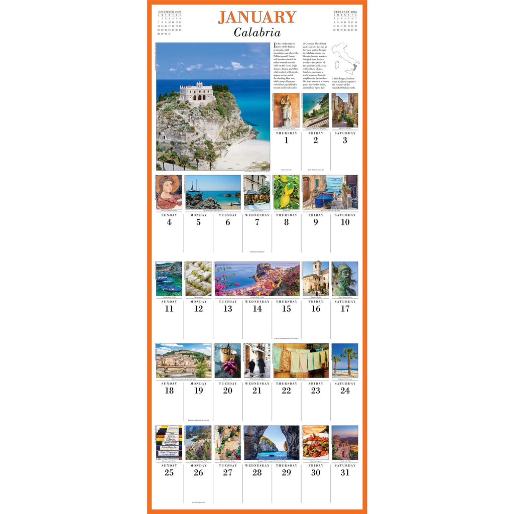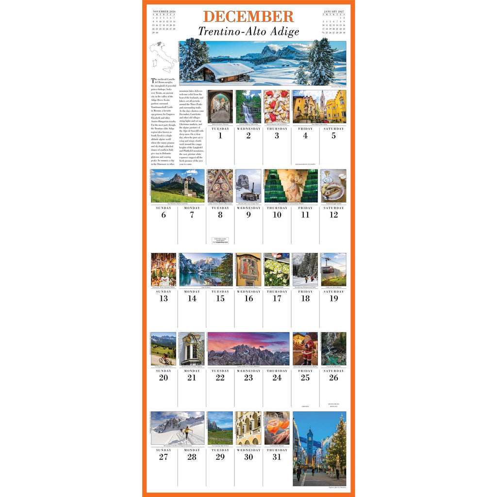 Viva Italia ! Chaque mois de ce calendrier mural « Une photo par jour » met à l'honneur une région ou une ville figurant sur la liste des destinations de voyage incontournables de tous, avec un itinéraire détaillé comprenant une carte, une description de son histoire et de ses points forts, ainsi que plus de 20 photos réparties dans la grille.