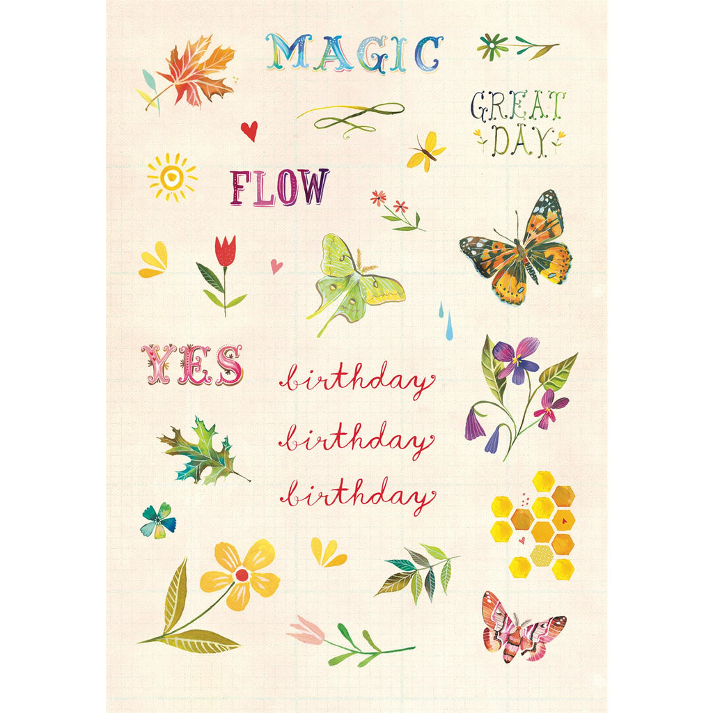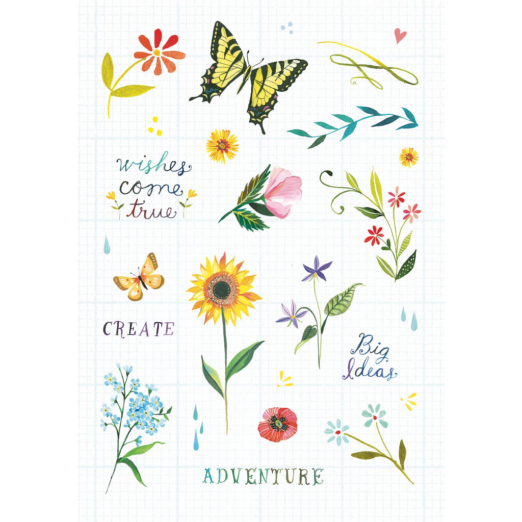 Personnalisez votre agenda Katie Daisy avec plus de 160 autocollants ravissants, illustrés à la main, pour marquer les jours spéciaux avec des fleurs sauvages colorées, des papillons, des abeilles, des champignons et des mots calligraphiés !