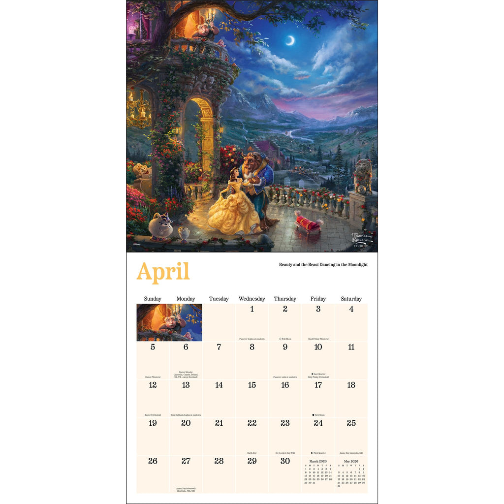 Ce calendrier de 12 mois inclut une double page bonus pour la période de septembre à décembre 2025. Outre ses magnifiques illustrations, chaque double page mensuelle présente le mois précédent et le mois suivant, les principales fêtes et commémorations internationales, les phases de la lune et offre un espace généreux pour vos propres rappels et événements spéciaux. Caractéristiques : 30,5 cm x 30,5 cm (30,5 cm x 61 cm ouvert). La conception de la couverture permet d’éviter l’utilisation d’emballages plastiques. Imprimé sur du papier certifié FSC® avec de l’encre à base de soja. Double page de planification pour la période de septembre à décembre 2025. Couvre la période de janvier à décembre 2026. Grand espace quadrillé pour vos notes, rendez-vous et rappels. Principales fêtes et commémorations internationales. Phases de la lune, selon le temps universel coordonné (UTC). Images en couleur issues de la collection Disney Dreams par Thomas Kinkade Studios © Disney.