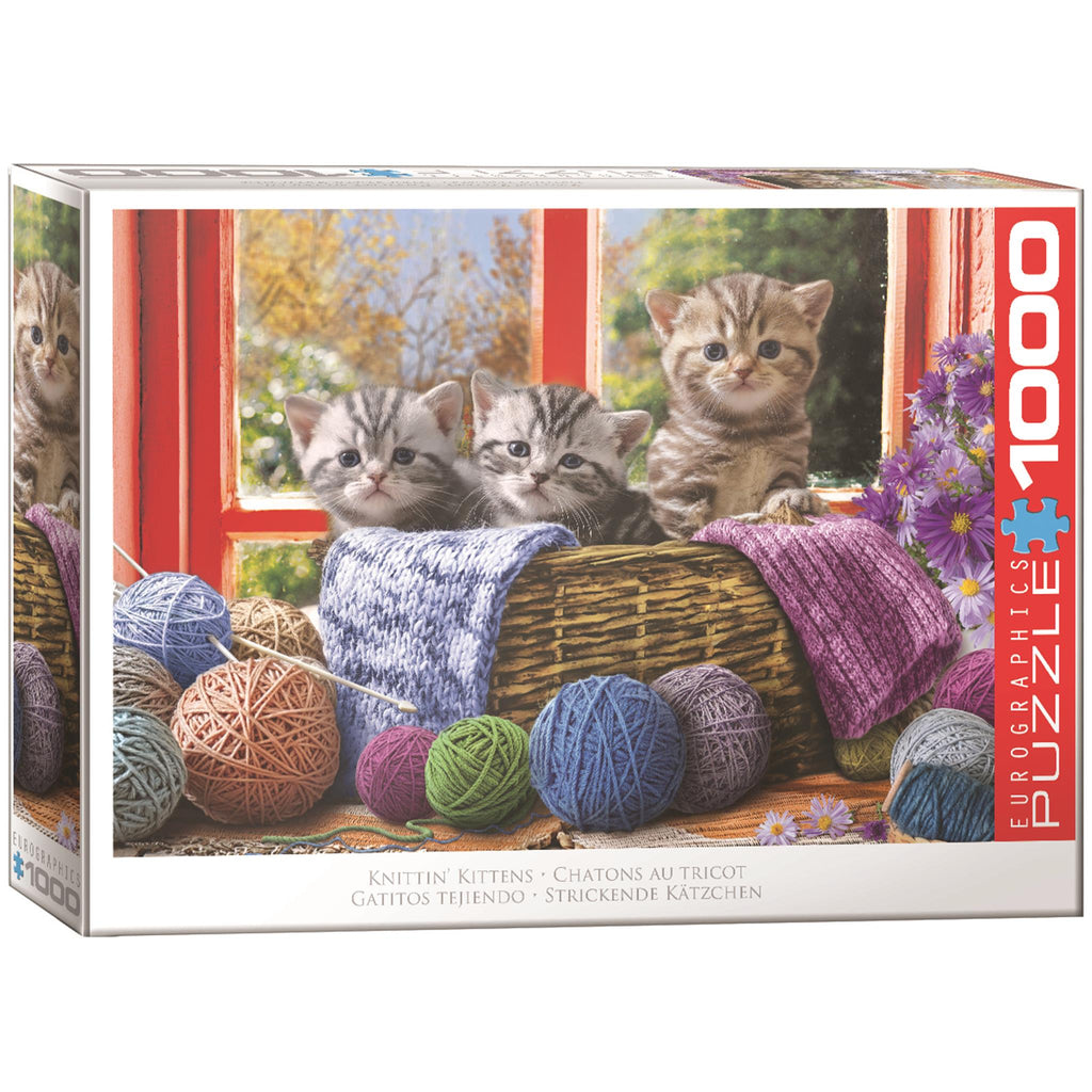 Puzzle EuroGraphics Knittin Kittens de 1000 pièces. Dimensions du puzzle terminé : 49 x 67 cm. Trois adorables chatons font des bêtises en explorant un panier rempli de pelotes de laine. Pièces de puzzle robustes et de haute qualité. Fabriqué à partir de carton bleu recyclé et imprimé avec des encres végétales. Fabriqué aux États-Unis. Exclusivité du Calendar Club.