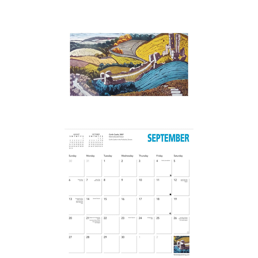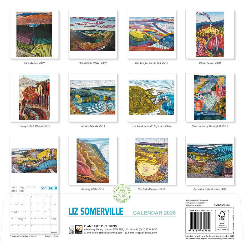 L'artiste peintre et graveuse Liz Somerville est diplômée de l'École d'art de Winchester (1988), où elle a obtenu un diplôme en design textile. Après seize ans passés à travailler comme designer à Londres, elle s'est installée dans le Dorset et s'est consacrée pleinement à son art. Ses œuvres ont été largement exposées dans des galeries et expositions à travers le Royaume-Uni, notamment à la Royal West of England Academy de Bristol et au Russell-Cotes Museum de Bournemouth. Liz aime créer des scènes qui invitent le spectateur à découvrir une histoire. Elle est fascinée par le relief et le mouvement des paysages, les couleurs inattendues, les traces du passé, les textures et les formes. Elle mêle gravure et peinture, ce qui confère une fluidité à l'esthétique parfois statique de la gravure traditionnelle. Ce calendrier présente douze de ses magnifiques paysages. Le bloc-notes affiche les vues des mois précédents et suivants. Imprimé sur papier certifié FSC, emballage sans plastique.