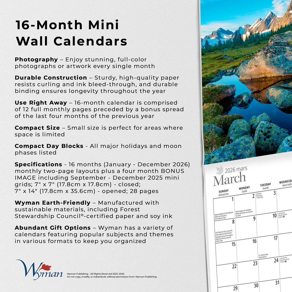Admirez la majesté et la splendeur naturelle des Rocheuses canadiennes, le plus vaste massif montagneux d'Amérique du Nord. S'étendant sur une partie de la Colombie-Britannique et de l'Alberta, les Rocheuses canadiennes offrent un paysage de sommets enneigés imposants, de lacs cristallins, de rivières sinueuses et de vallées verdoyantes qui inspirent l'art sous toutes ses formes depuis des siècles. Ce mini calendrier mural est en anglais.