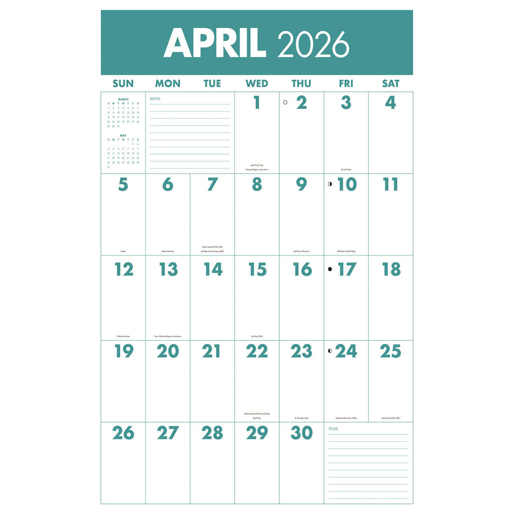 Besoin de beaucoup d'espace pour organiser un emploi du temps chargé ? Le calendrier mural Mammoth Grid est le plus grand disponible pour 2026 ! Covoiturage, activités sportives, réunions, anniversaires, rendez-vous… le Mammoth Grid peut tout noter ! Chaque case mesure 7,6 cm de large et 14 cm de long, offrant ainsi suffisamment de place pour écrire, même dans les maisons et les bureaux les plus animés. Visuellement lumineux, coloré et facile à lire, il comprend un espace supplémentaire pour prendre des notes chaque mois, les jours fériés internationaux et les phases de la lune. Sa reliure spirale métallique assure une solidité optimale. Une fois ouvert, il mesure 56 cm de large et 86 cm de haut.
