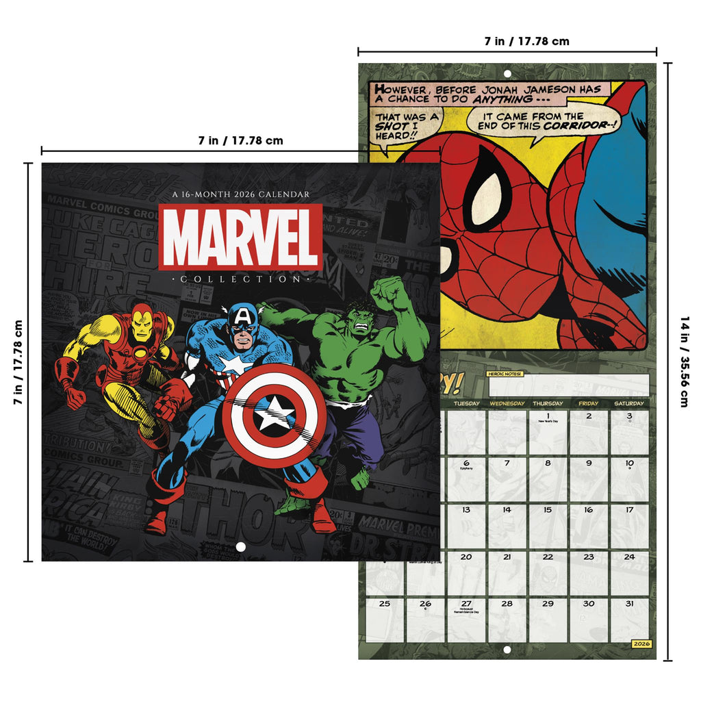 Retrouvez les héros Marvel classiques — Spider-Man, Thor, Captain America et leurs amis — dans le mini-calendrier Marvel Comics 2026, rempli d'illustrations de comics pleines d'action. Boum ! Paf ! Thwip ! Idéal pour les petits espaces, ce mini-calendrier de 16 mois comprend des pages mensuelles de janvier à décembre 2026, ainsi qu'une page regroupant les quatre derniers mois de 2025. Chaque page mensuelle inclut les jours fériés et les phases de la lune, avec des cases journalières pour noter vos tâches et rendez-vous et vous aider à rester organisé. Il contient 13 images de haute qualité dans un format compact, imprimées sur du papier premium certifié FSC (Forest Stewardship Council). Parfait pour décorer les casiers scolaires, les camping-cars, les petits bureaux et les chambres d'étudiant.