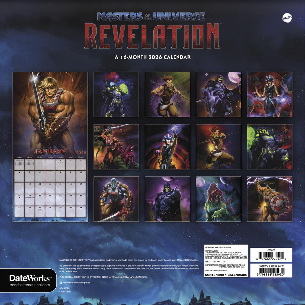 He-Man, She-Ra et les Maîtres de l'Univers sont une franchise télévisée pour enfants parmi les plus appréciées de tous les temps. Organisez votre emploi du temps avec le calendrier 2026 des Maîtres de l'Univers ! Ses aventures spatiales, entre barbares et princesses, captiveront les enfants de toutes générations. Ce calendrier mural de seize mois propose des pages mensuelles de janvier à décembre 2026, ainsi qu'une page récapitulative des quatre derniers mois de 2025. Chaque page mensuelle inclut les jours fériés et les phases de la lune, avec des cases journalières suffisamment grandes pour noter vos tâches et rendez-vous et vous aider à rester organisé. Il comprend 13 images de haute qualité imprimées sur du papier premium certifié FSC (Forest Stewardship Council). Idéal pour décorer un mur, un tableau d'affichage ou un panneau de liège, à la maison, à l'école ou au bureau.