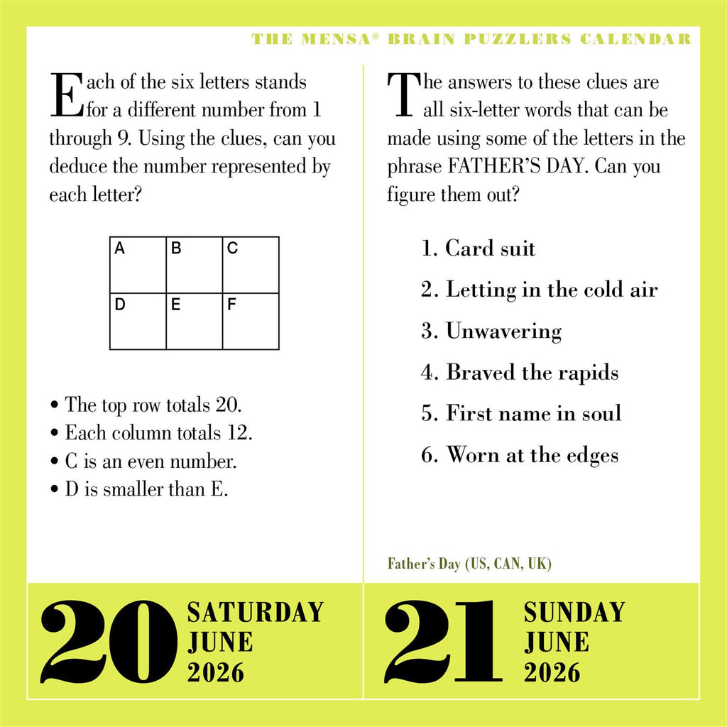 DÉMARREZ VOTRE JOURNÉE PAR UN DÉFI : Stimulez votre esprit avec un mélange dynamique de jeux de mots, de problèmes de chiffres, d’énigmes logiques et autres casse-têtes cérébraux. UN CADEAU GÉNIAL : Ce calendrier est idéal pour tous ceux qui souhaitent développer leurs capacités intellectuelles et stimuler leur cerveau ; un cadeau de Mensa, c’est la preuve de votre intelligence. Parfait pour la famille, les amis, les enseignants ou tout intellectuel de votre entourage ! MAINTENANT SANS PLASTIQUE ! : Les calendriers Page-A-Day® sont écologiques ! Imprimés sur du papier issu de sources responsables et 100 % recyclable, avec un support en carton robuste.