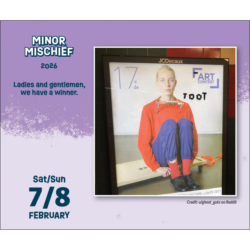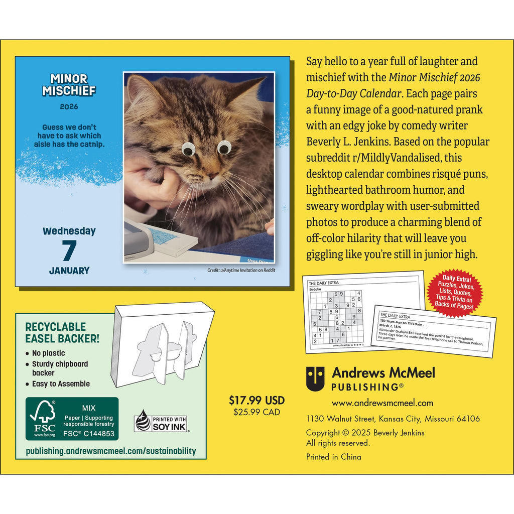 Chaque page du calendrier quotidien « Petites Farces 2026 » présente une image amusante d'une blague bon enfant (souvent un petit graffiti), accompagnée d'un commentaire hilarant de l'auteure humoristique Beverly L. Jenkins qui vous fera mourir de rire. Inspiré du populaire subreddit r/MildlyVandalised, ce calendrier de bureau est un mélange charmant de traits d'esprit mordants, d'humour potache et de jeux de mots osés – parfait pour tous ceux qui ont un penchant pour le sarcasme, les blagues grivoises et les farces. Caractéristiques : Sans plastique à usage unique. Format : 13,7 x 11,4 cm. Support chevalet en carton recyclable pour une présentation sur un bureau ou une table. Imprimé sur du papier certifié FSC® avec de l'encre à base de soja. Pages détachables en couleur. Au verso, du contenu supplémentaire quotidien : jeux, blagues, citations. Date et jour indiqués sur chaque page. Pages week-end regroupées. Jours fériés et commémorations officiels dans le monde entier. Chaque page présente une photo amusante d'une farce publique accompagnée d'une légende irrévérencieuse, comique ou vulgaire.