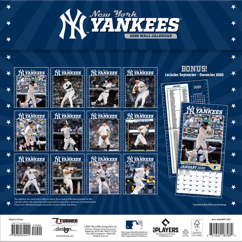 Conçu pour les passionnés de baseball, ce calendrier mural présente chaque mois des photos grand format de vos joueurs préférés des Yankees de New York ! Chaque mois inclut également des informations sur l'équipe et les joueurs, avec les couleurs et le logo des Yankees. D'une qualité exceptionnelle, ce calendrier de 30,5 x 30,5 cm contient des pages bonus présentant la période de septembre à décembre 2025 et les résultats des Séries mondiales précédentes ! Format 12 mois (janvier à décembre 2026). Dimensions : 30,5 cm (largeur) x 61 cm (hauteur) (ouvert).