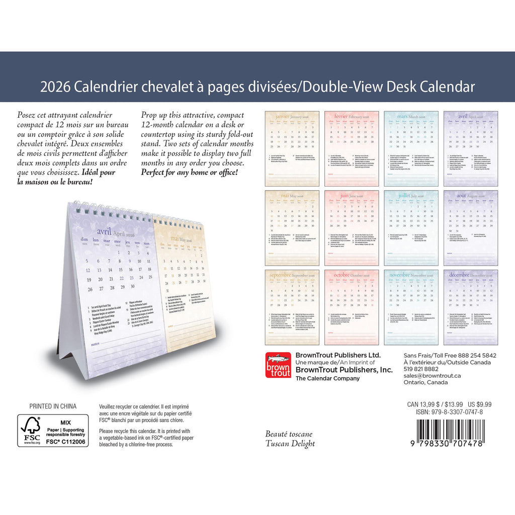 Pas besoin de mur ! Posez ce calendrier compact et amusant sur un bureau ou un comptoir grâce à son support solide et pliable. Vous aimez vraiment l'une des images ? Chaque mois du calendrier est séparé de l'image, ce qui vous permet de choisir l'image qui accompagne le mois. Gardez une trace des dates et des rendez-vous importants grâce au calendrier chevalet double vue Délices de Toscane. Ce chevalet double vue est produit en anglais. - - - Qui a besoin d'un mur ? Placez ce calendrier attrayant et compact sur un bureau ou un comptoir, grâce à son chevalet pliable. Vous aimez vraiment l’une des images ? Les mois calendaires sont séparés des images afin que vous puissiez choisir l'image qui accompagne le mois. Gardez une trace des dates et rendez-vous importants avec ce calendrier sur chevalet à double motif. Ce calendrier chevalet double vue est disponible en anglais.