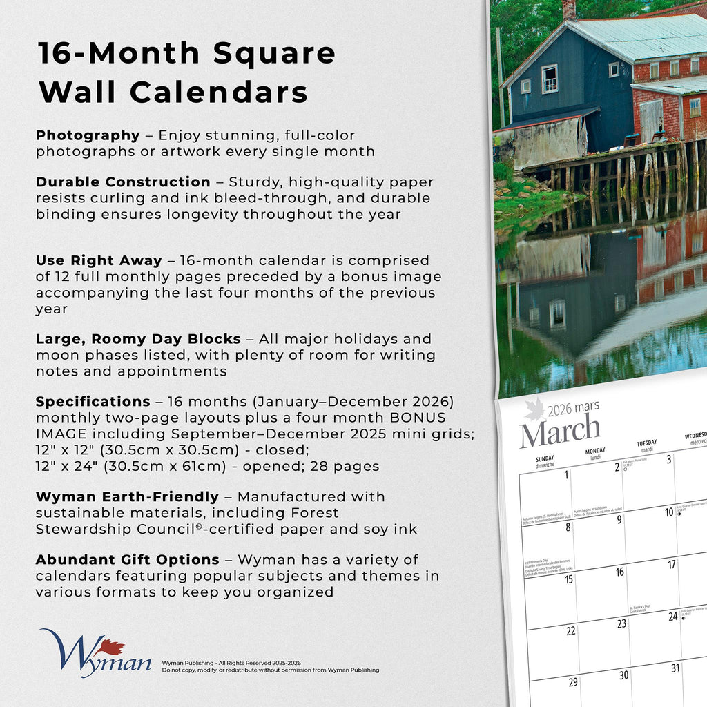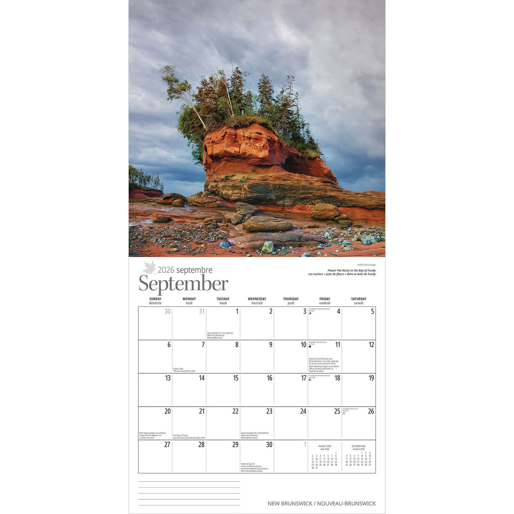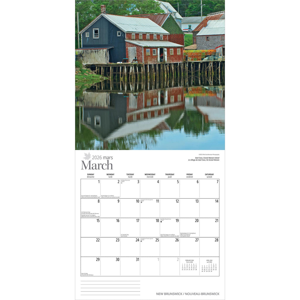 Un accueil chaleureux et des plaisirs simples attendent les visiteurs du Nouveau-Brunswick. De ses grands fleuves et plages de sable fin à ses forêts denses et ses fermes pastorales, le Nouveau-Brunswick est un lieu de diversité et de beauté. Ce calendrier mural carré est bilingue (anglais, français).