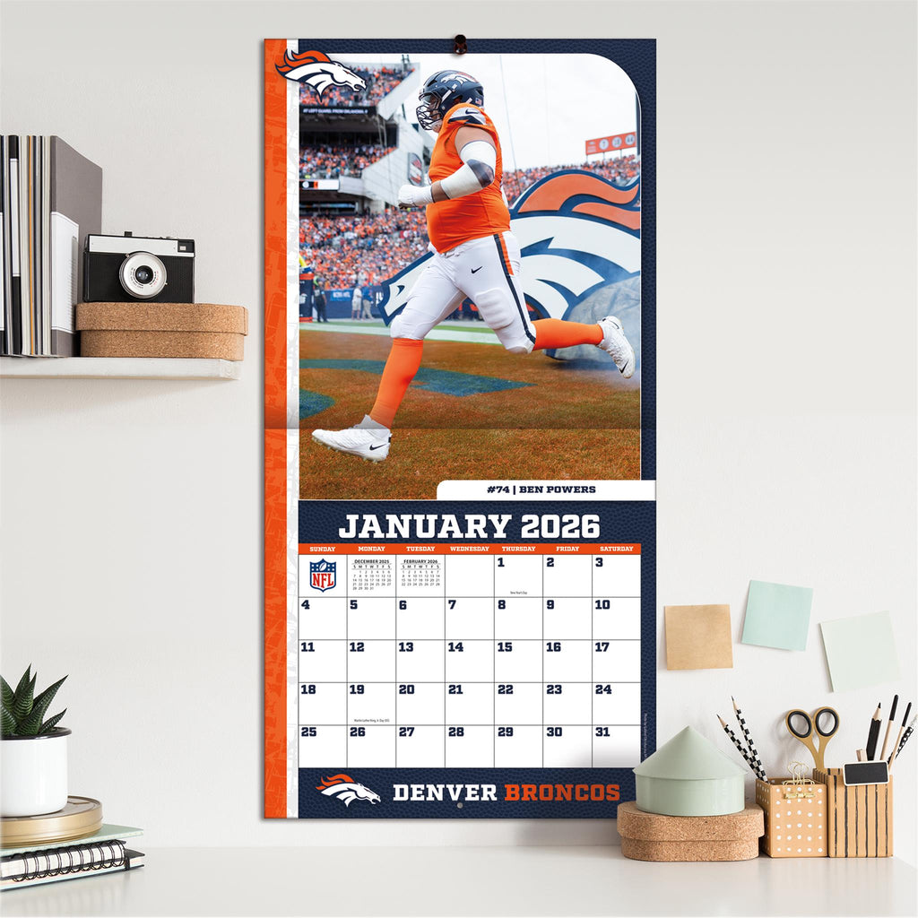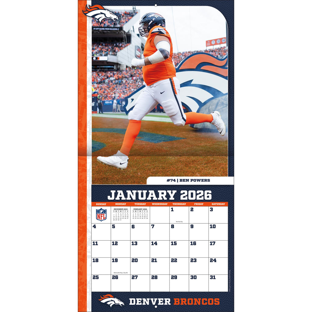 Conçu pour les passionnés de football américain, ce calendrier mural présente chaque mois des photos grand format de vos joueurs préférés des Broncos de Denver ! Découvrez également la biographie de chaque joueur et de nouveaux visuels aux couleurs et logos de l'équipe. D'une qualité exceptionnelle, ce calendrier 30 x 30 cm inclut des pages bonus : septembre à décembre 2025 et les résultats des Super Bowls précédents ! Format 12 mois (janvier à décembre 2026). Dimensions : 30,5 cm (largeur) x 61 cm (hauteur) (ouvert).