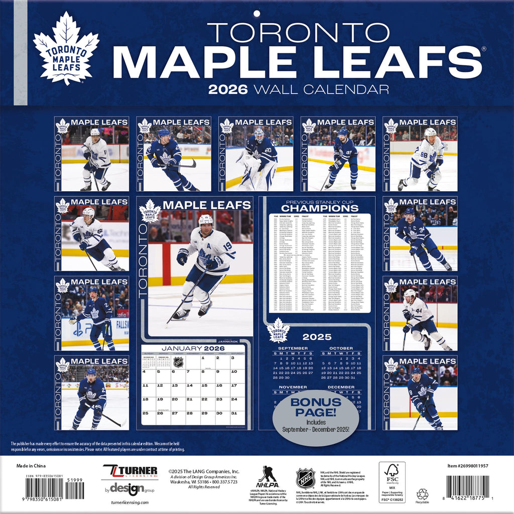 Ce calendrier mural est un incontournable pour tout fan inconditionnel des Maple Leafs de Toronto ! Conçu pour les passionnés de hockey, il présente des photos grand format en couleur de vos joueurs préférés. Chaque mois inclut également la biographie d'un athlète professionnel et des illustrations attrayantes aux couleurs et logos de l'équipe. D'une qualité exceptionnelle, ce calendrier de 30,5 x 30,5 cm contient des pages bonus retraçant la période de septembre à décembre 2025 et les résultats des finales de la Coupe Stanley des années précédentes. Format 12 mois (janvier à décembre 2026). Dimensions : 30,5 cm (largeur) x 61 cm (hauteur) (ouvert).