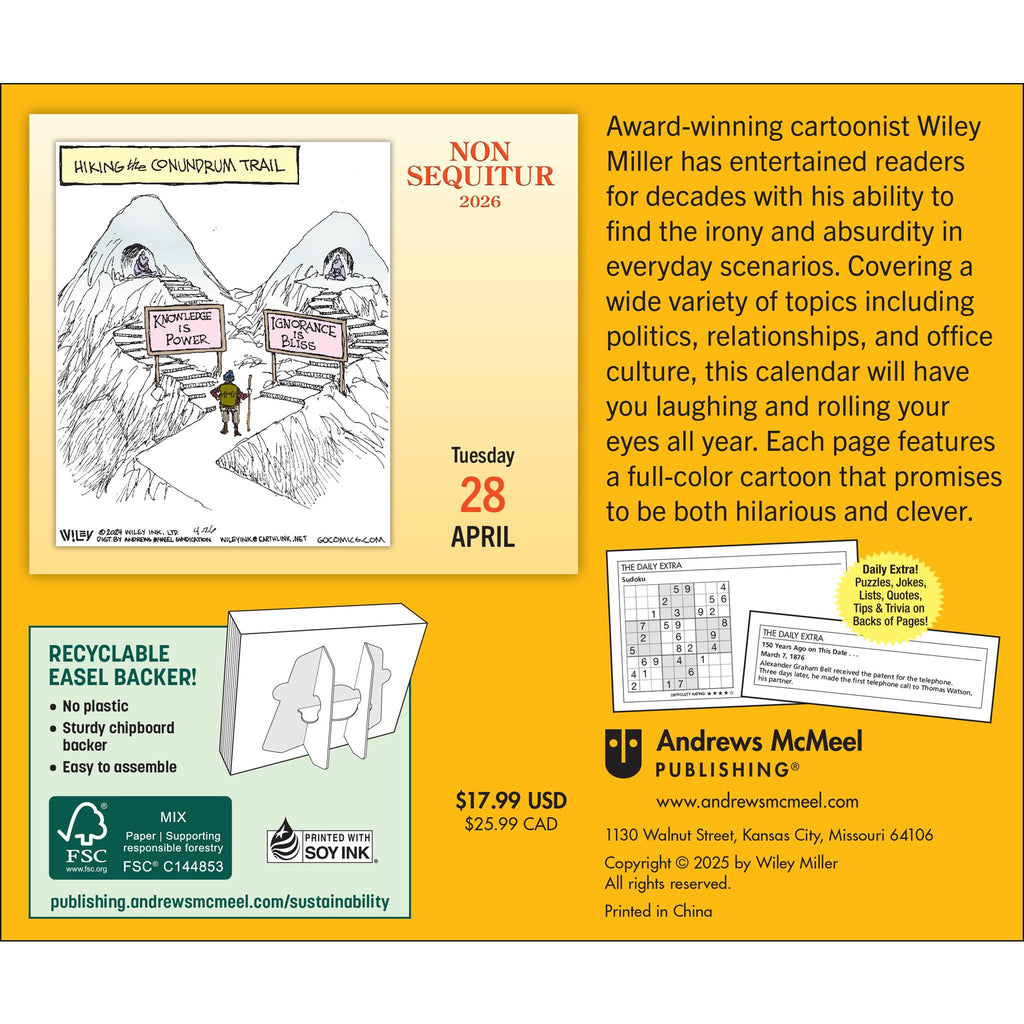 Le dessinateur primé Wiley Miller a véritablement révolutionné le genre de la bande dessinée avec la création de Non Sequitur. Depuis plus de trente ans, cette série culte et novatrice fait rire des millions de fans à travers le monde grâce à son regard ironique sur les absurdités de la vie moderne. Chaque page de ce calendrier de bureau présente une nouvelle BD humoristique de Non Sequitur. Caractéristiques : Sans plastique à usage unique. Format : 13,7 x 11,4 cm. Support chevalet en carton recyclable pour une présentation sur un bureau ou une table. Imprimé sur du papier certifié FSC® avec de l’encre à base de soja. Pages détachables en couleur. Au verso, des bonus quotidiens : jeux, blagues, citations et anecdotes. Date et heure indiquées sur chaque page. Pages regroupant les jours du week-end. Jours fériés et commémorations officiels. Une nouvelle BD en couleur chaque jour.