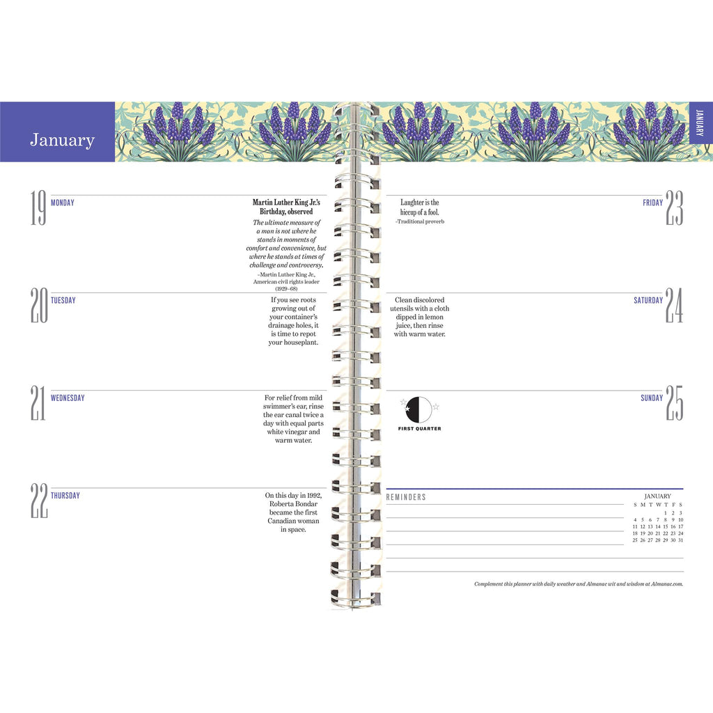 S'organiser devient un jeu d'enfant avec cet agenda hebdomadaire/mensuel unique et magnifique, qui fête cette année ses 31 ans ! Son contenu ? Un véritable trésor ! De superbes illustrations originales en couleurs. Un calendrier 2026 en début d'agenda vous permet de visualiser rapidement l'année à venir : découvrez les jours de la semaine où tombent les anniversaires de vos proches, les jours fériés qui se transforment en longs week-ends, quand réserver vos vacances, et bien plus encore ! Douze grilles mensuelles vous offrent une vue d'ensemble de vos projets et rendez-vous. De plus, chaque double page propose une citation et un conseil intemporels, le nom et la date de la pleine lune, ainsi qu'un espace pour noter vos idées et objectifs. Un format hebdomadaire (du lundi au dimanche sur chaque double page) avec suffisamment d'espace chaque jour pour détailler vos rendez-vous, événements, rappels, observations et inspirations. Un petit calendrier sur chaque double page vous permet de consulter le mois entier en un clin d'œil, sans avoir à feuilleter l'agenda. Dans la plus pure tradition des almanachs, chaque jour est agrémenté d'un conseil, d'une information, d'une citation, d'un proverbe ou d'une légende. Principales fêtes et célébrations américaines et canadiennes. Phases de la lune (nouvelle lune, premier quartier, pleine lune), y compris les noms traditionnels des pleines lunes comme la Lune des Fraises et la Lune des Moissons. Éclipses solaires et lunaires. Calendrier 2027 à la fin pour une consultation rapide de l'année à venir, avec un espace pour des notes mensuelles. Pages pour noter vos mots de passe, adresses, numéros de téléphone et contacts d'urgence. Sa couverture rigide et sa construction robuste protègent vos précieuses notes. Mesurant 19 cm de large sur 26 cm de haut fermé, cet agenda est doté d'une reliure Wire-O métallique qui lui permet de s'ouvrir à plat pour une manipulation aisée. Ce magnifique agenda vous est proposé par The Old Farmers Almanac, qui prodigue depuis 233 ans des conseils pour cultiver un jardin luxuriant, gérer son temps, tenir une maison harmonieuse et profiter des merveilles de la Terre et du ciel ! Un cadeau idéal !